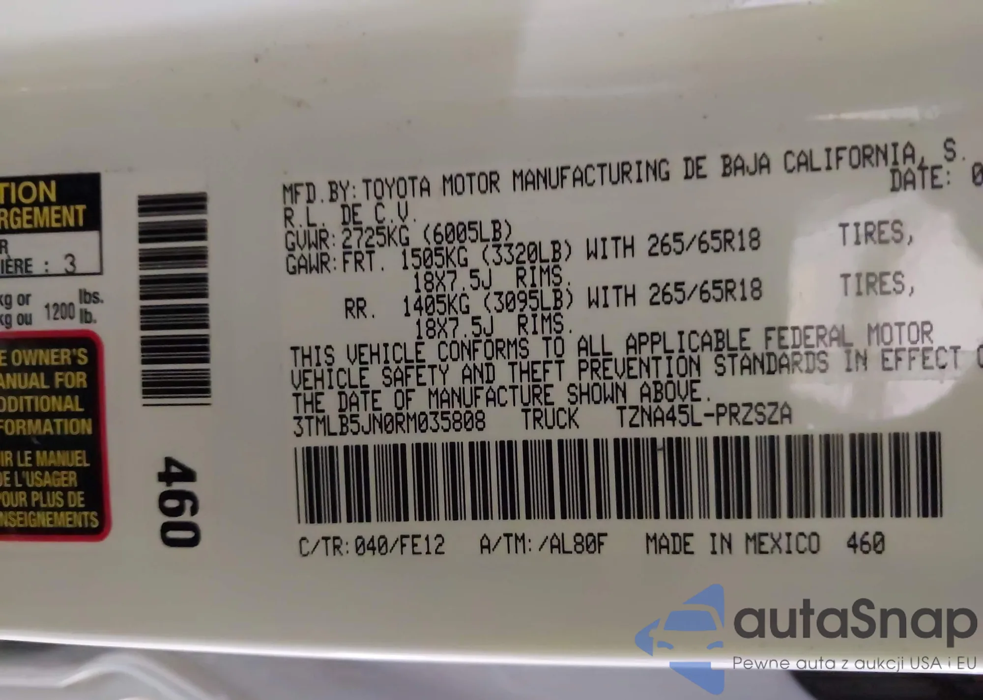 LOT: 43650195 VIN: 4T4BE46K59R097570