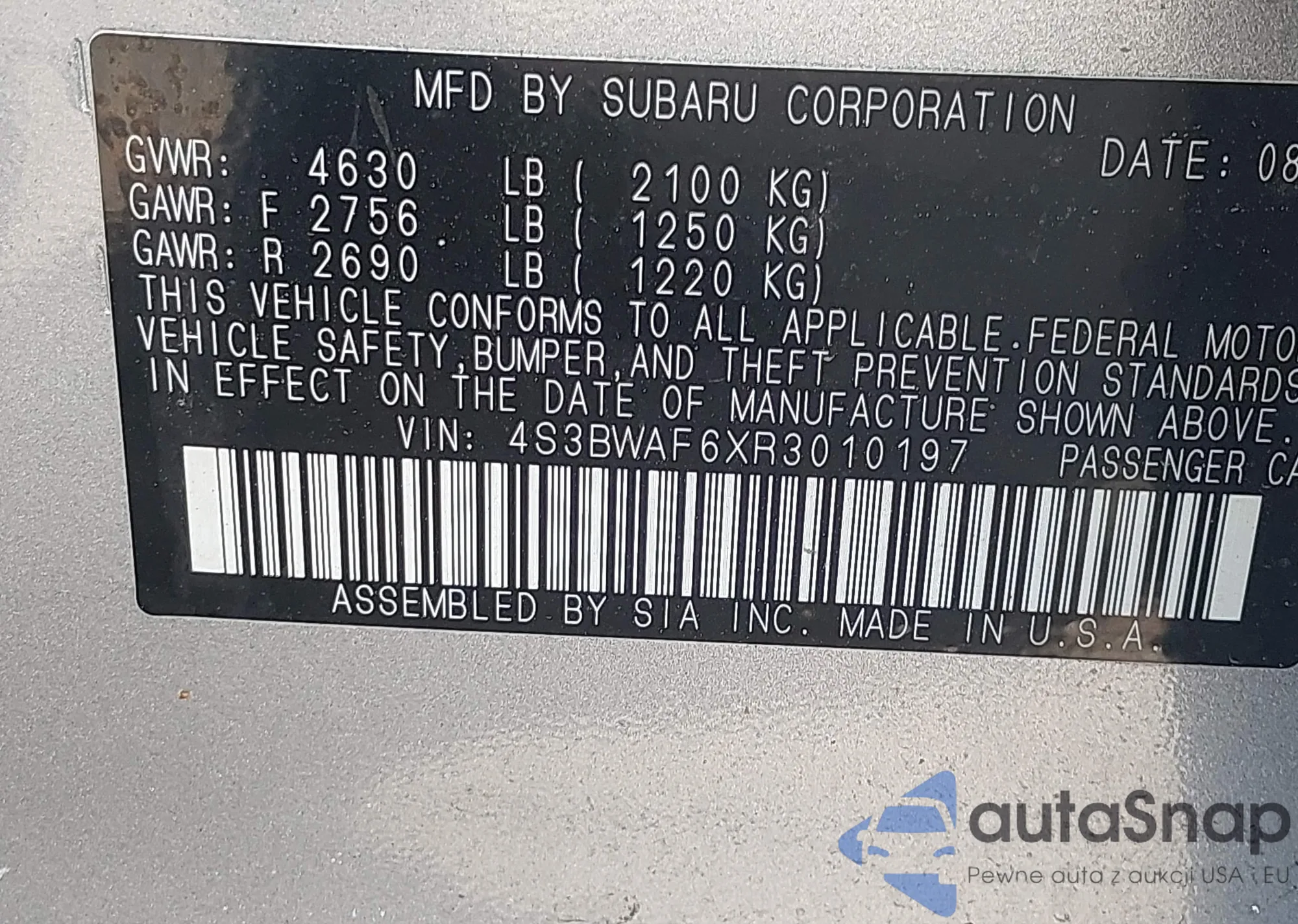 • VIN 4S3BWAF6XR3010197
