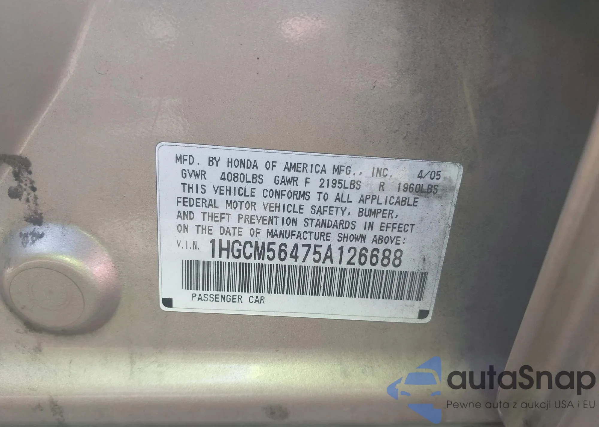 LOT: 43583456 VIN: 1HGCM56475A126688