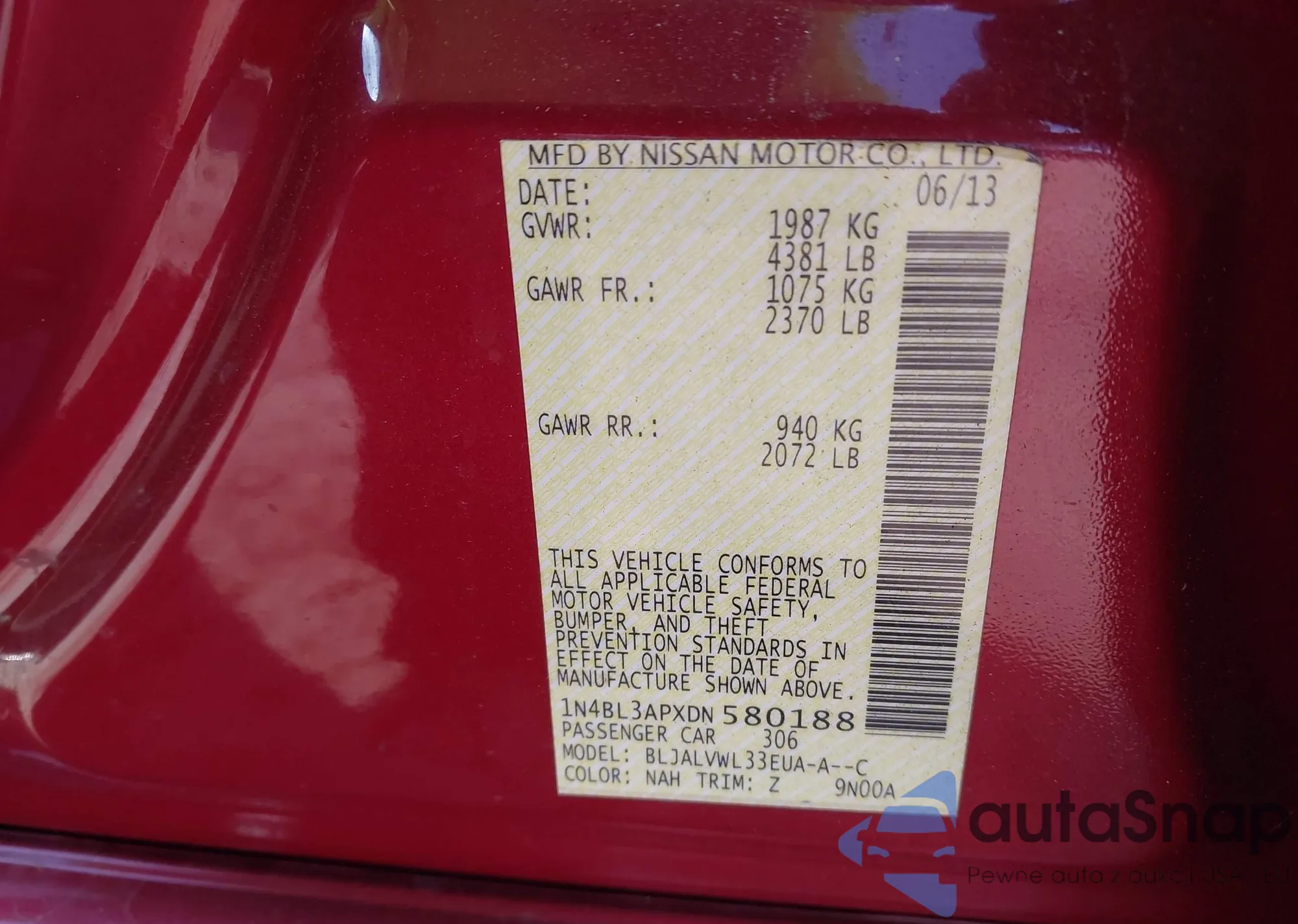 LOT: 43406991 VIN: 1N4BL3APXDN580188