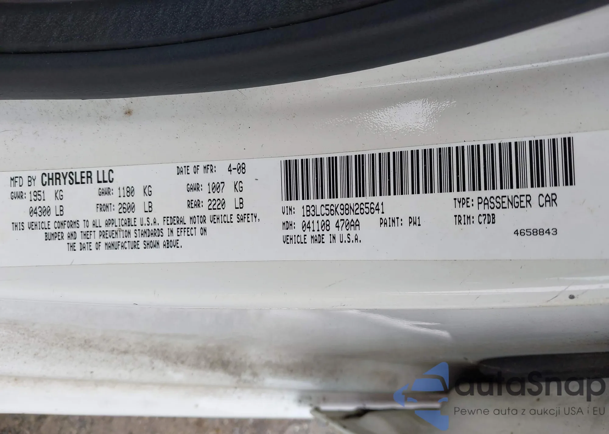 LOT: 43516988 VIN: 1B3LC56K98N265641