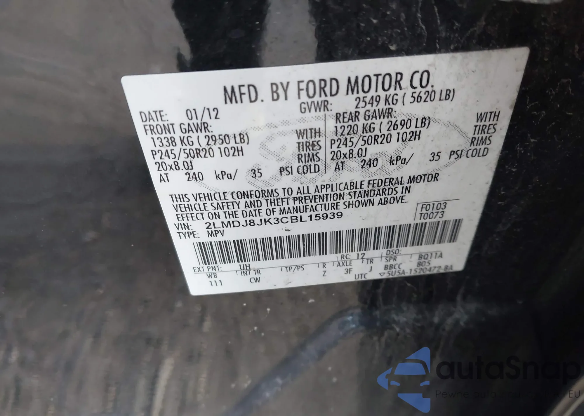 LOT: 43563842 VIN: 2LMDJ8JK3CBL15939