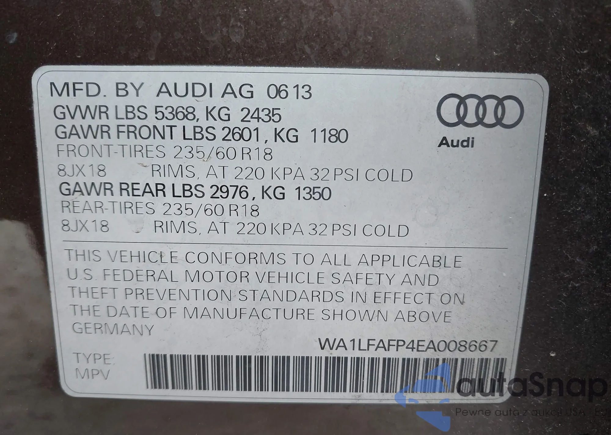 LOT: 42600250 VIN: WA1LFAFP4EA008667
