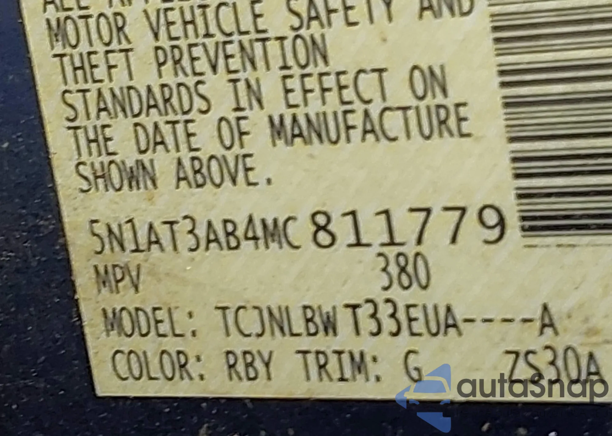 • VIN 5N1AT3AB4MC811779