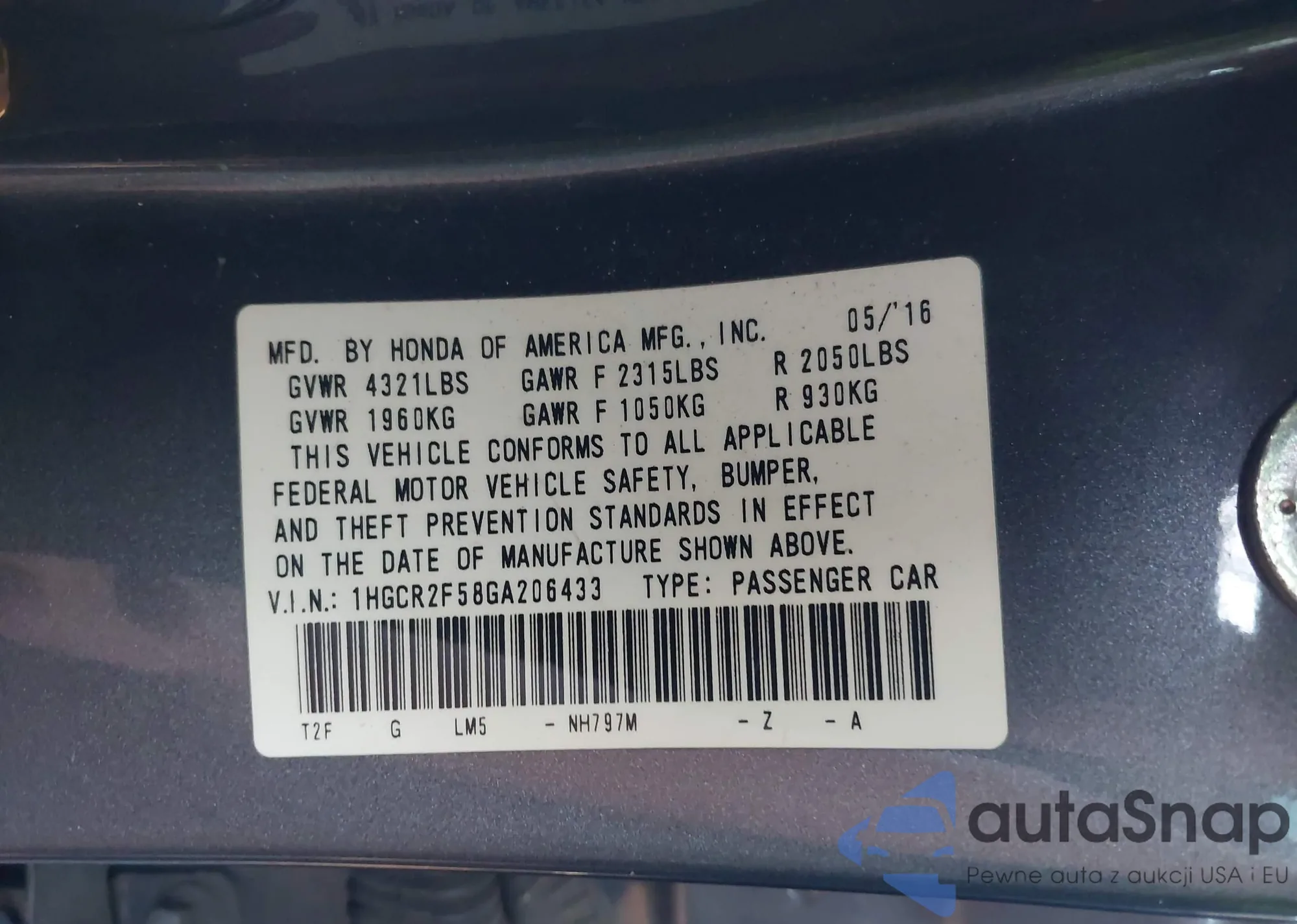 • VIN 1HGCR2F58GA206433