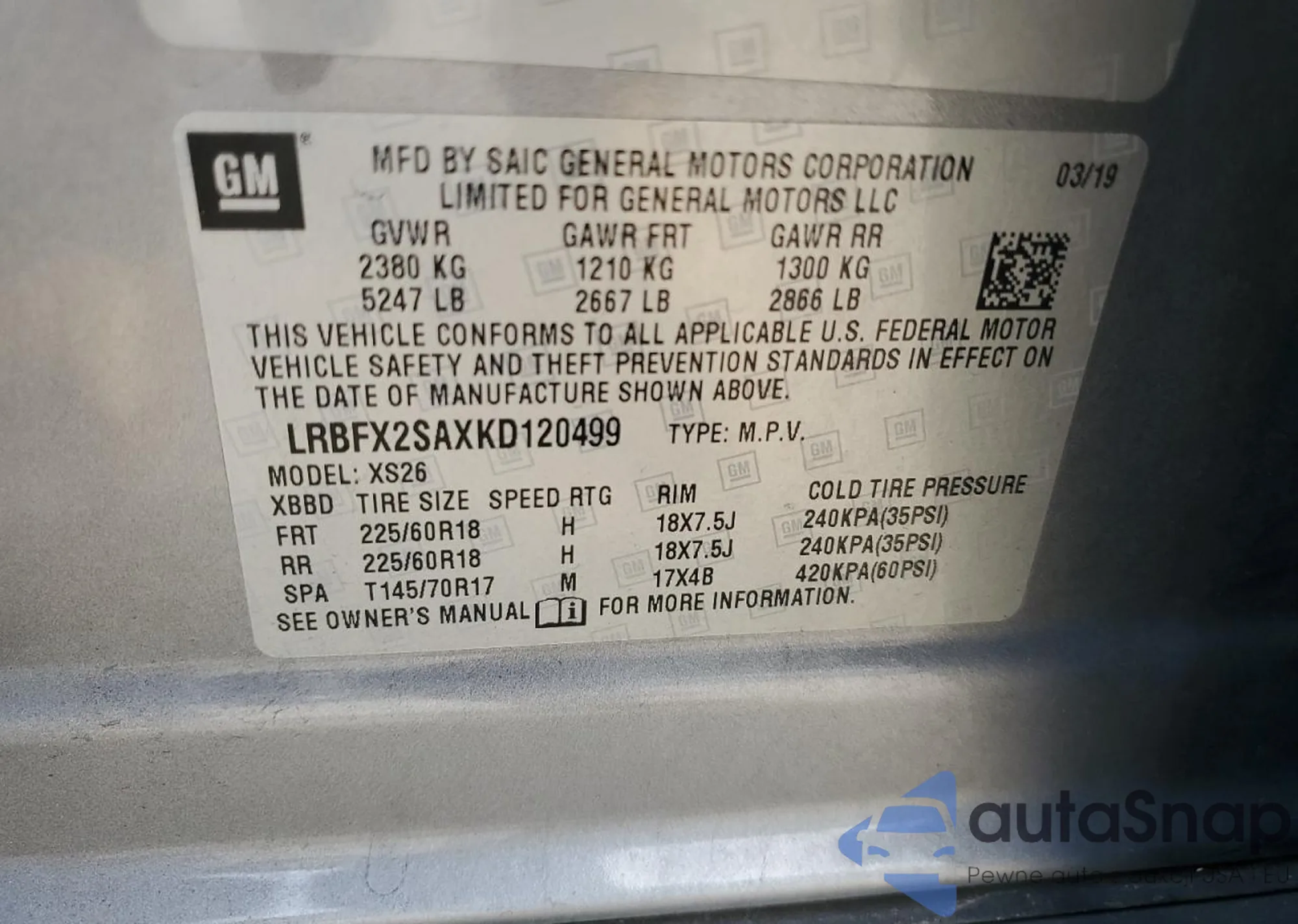 LOT: 82717885 VIN: 2HKRW6H31KH220745
