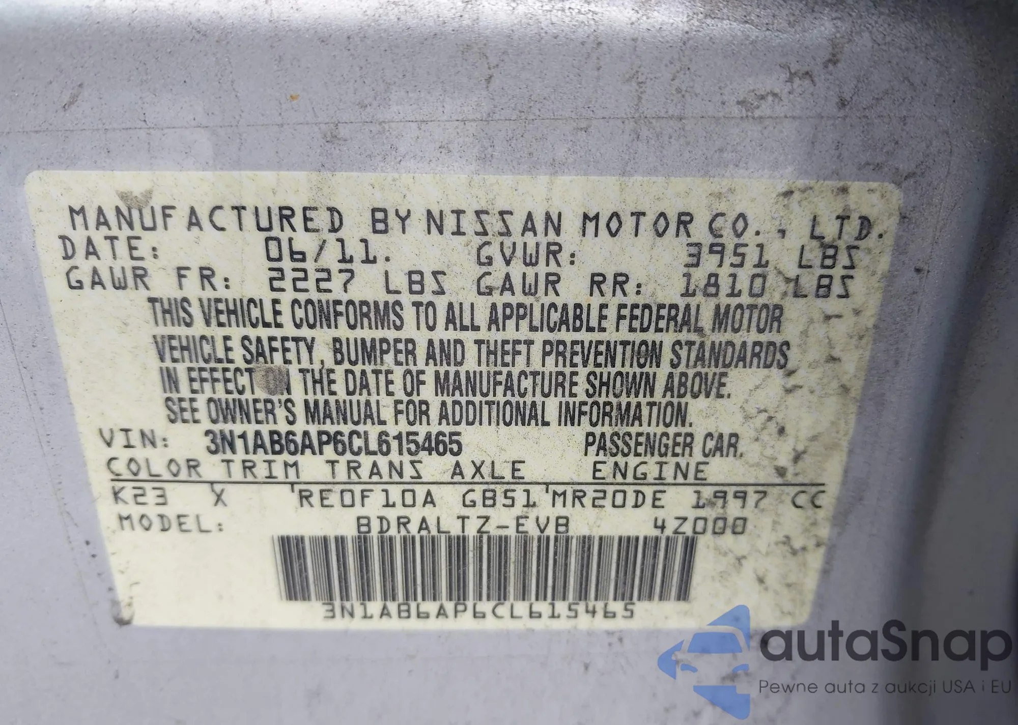 • VIN 3N1AB6AP6CL615465