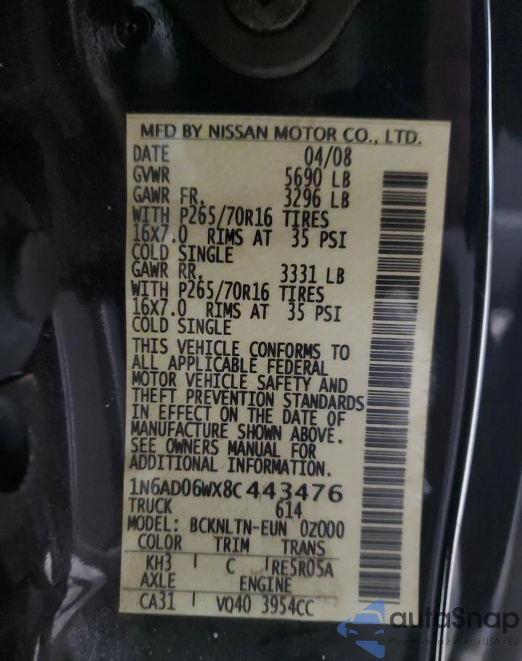 • VIN 1N6AD06WX8C443476