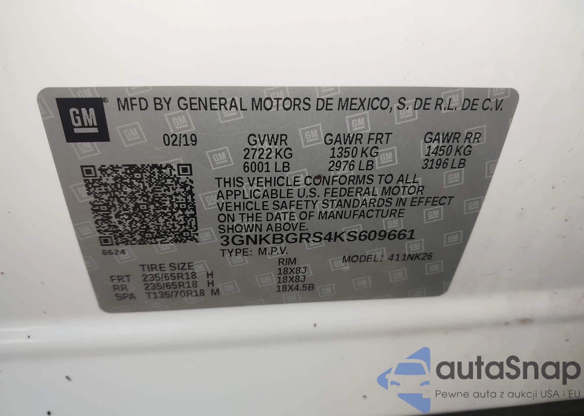 LOT: 43447061 VIN: 3GNKBGRS4KS609661
