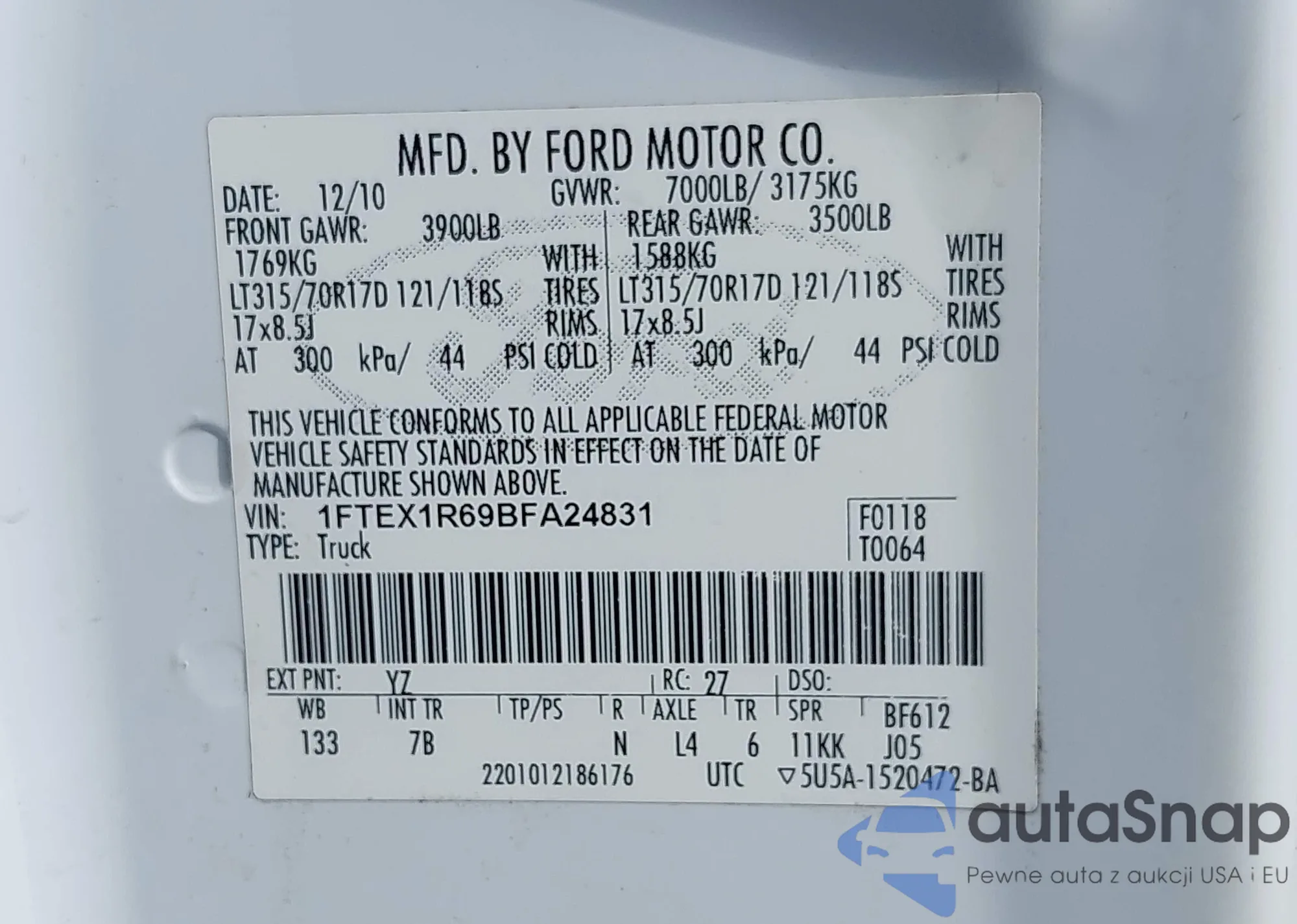 LOT: 42951431 VIN: 1FTPW14V19FA29090