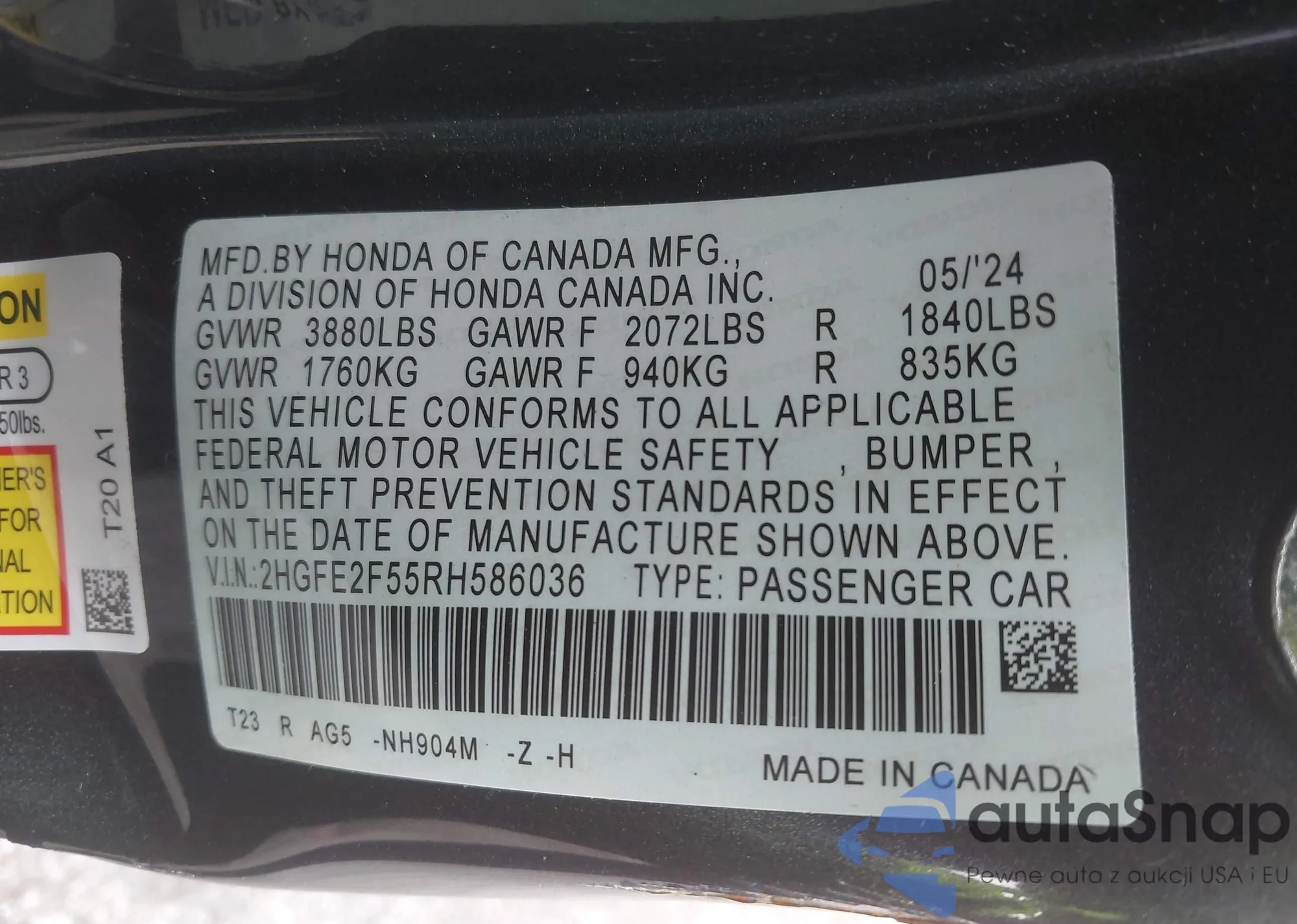 LOT: 43137539 VIN: 2HGFE2F55RH586036