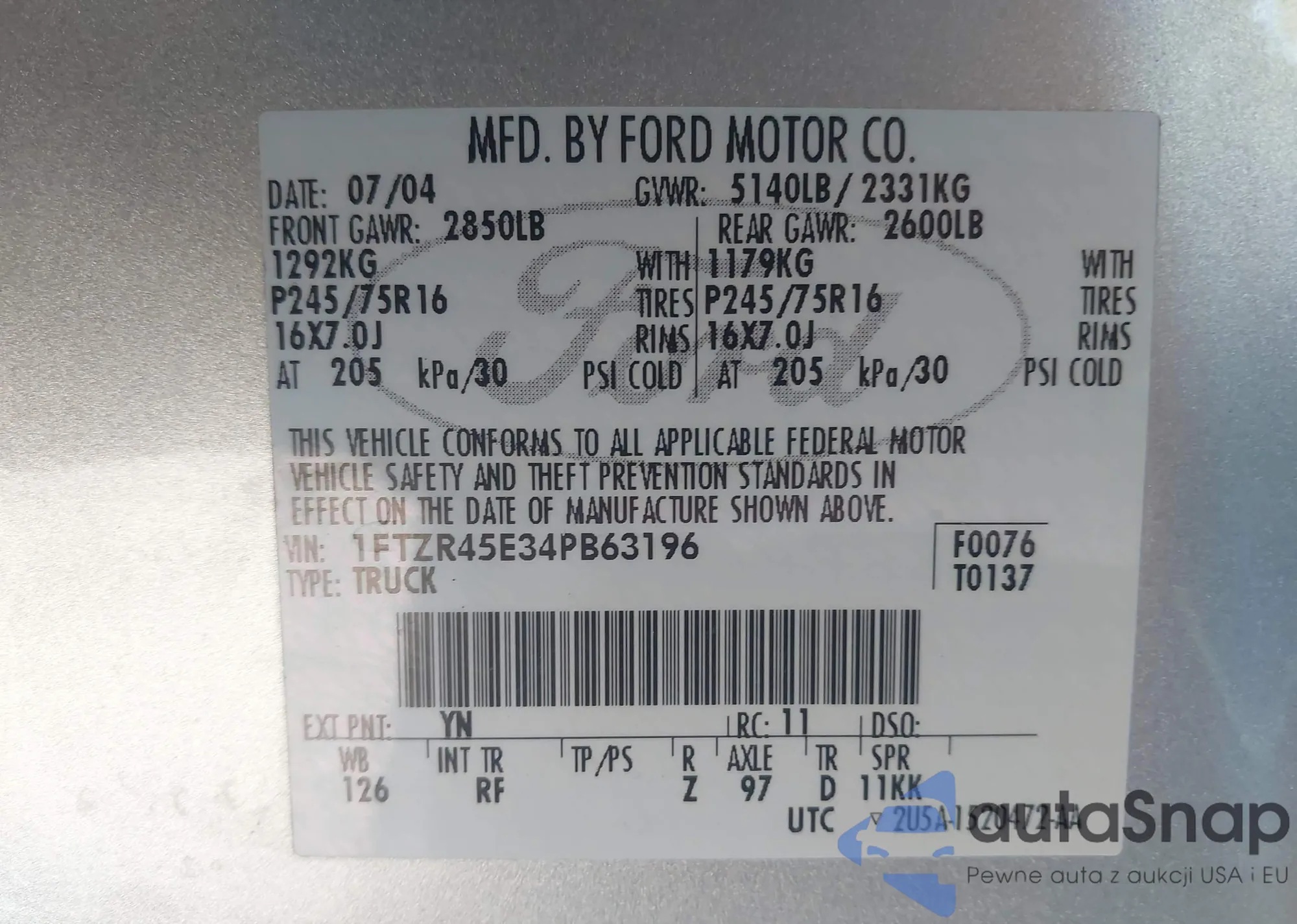 LOT: 43590201 VIN: 1FTZR45E34PB63196