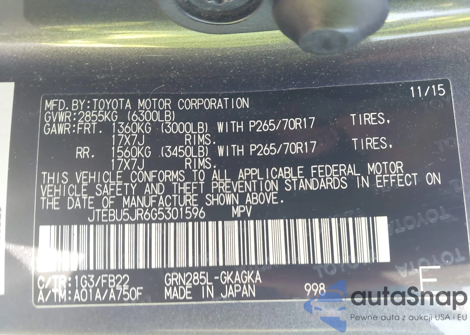 LOT: 43291305 VIN: JTEBU5JR6G5301596