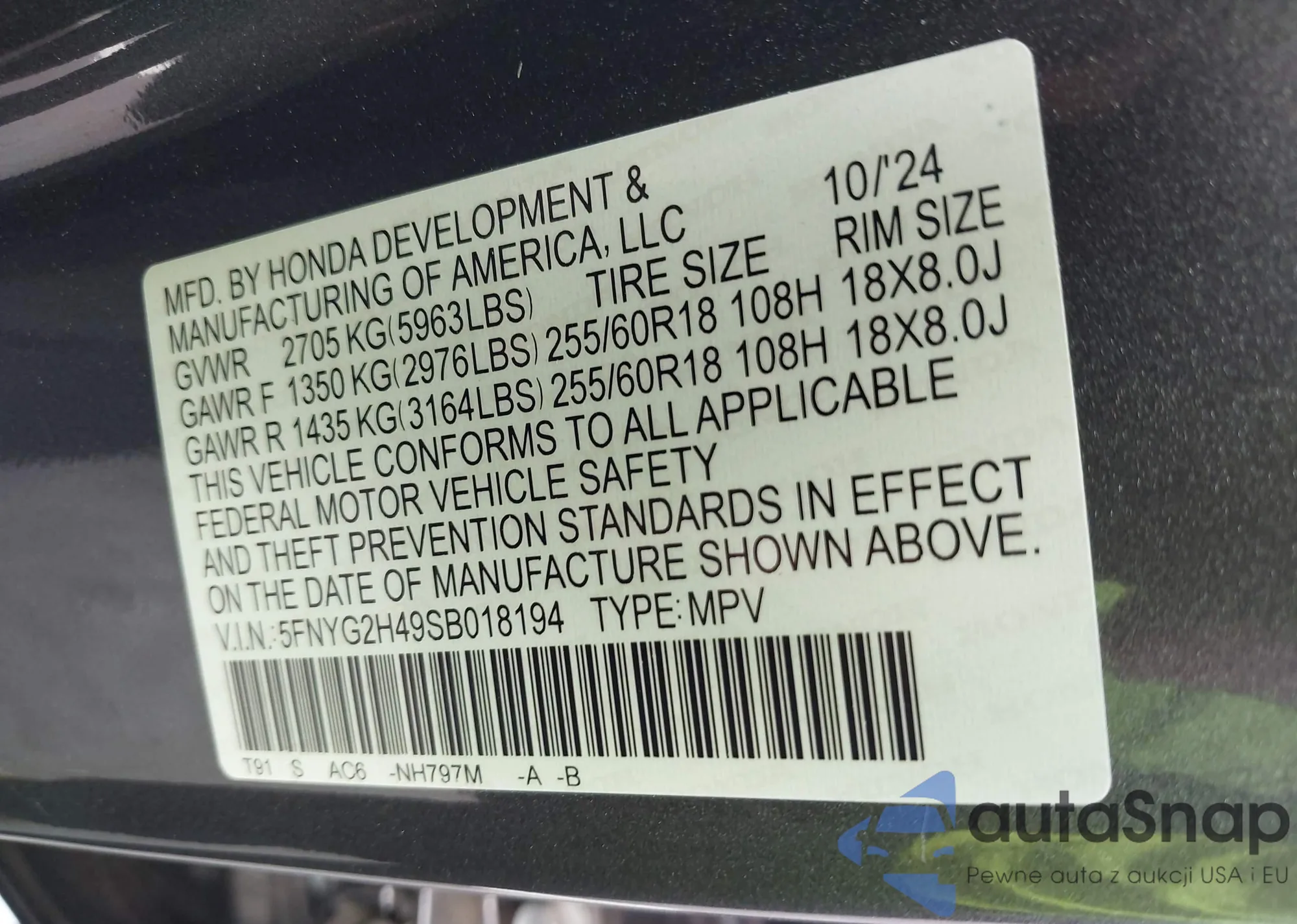 LOT: 43366318 VIN: 5FNYG2H49SB018194