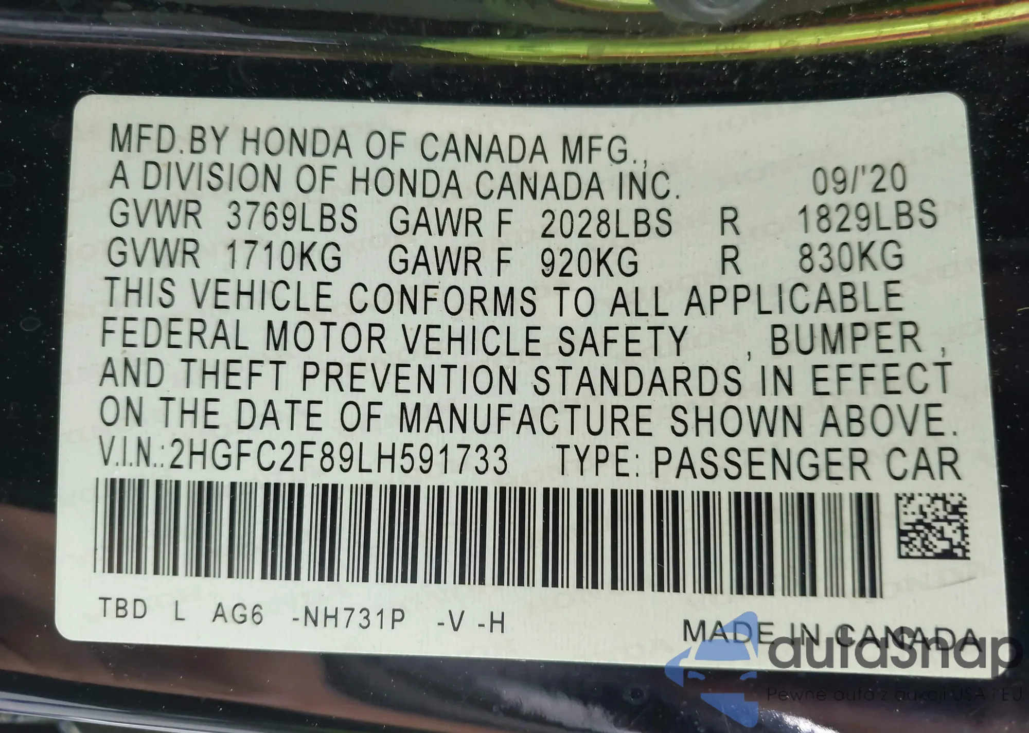 • VIN 2HGFC2F89LH591733