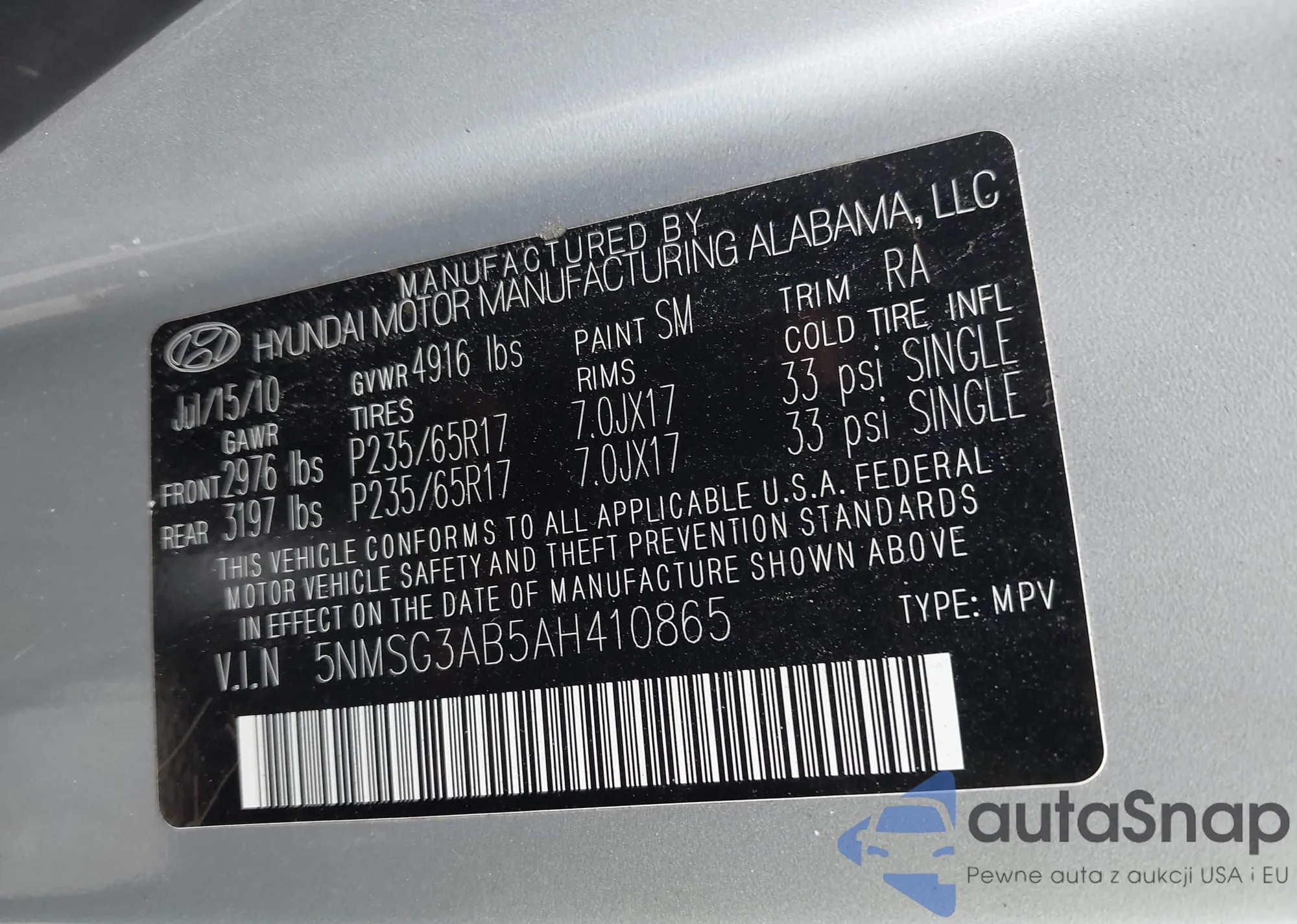 • VIN 5NMSG3AB5AH410865