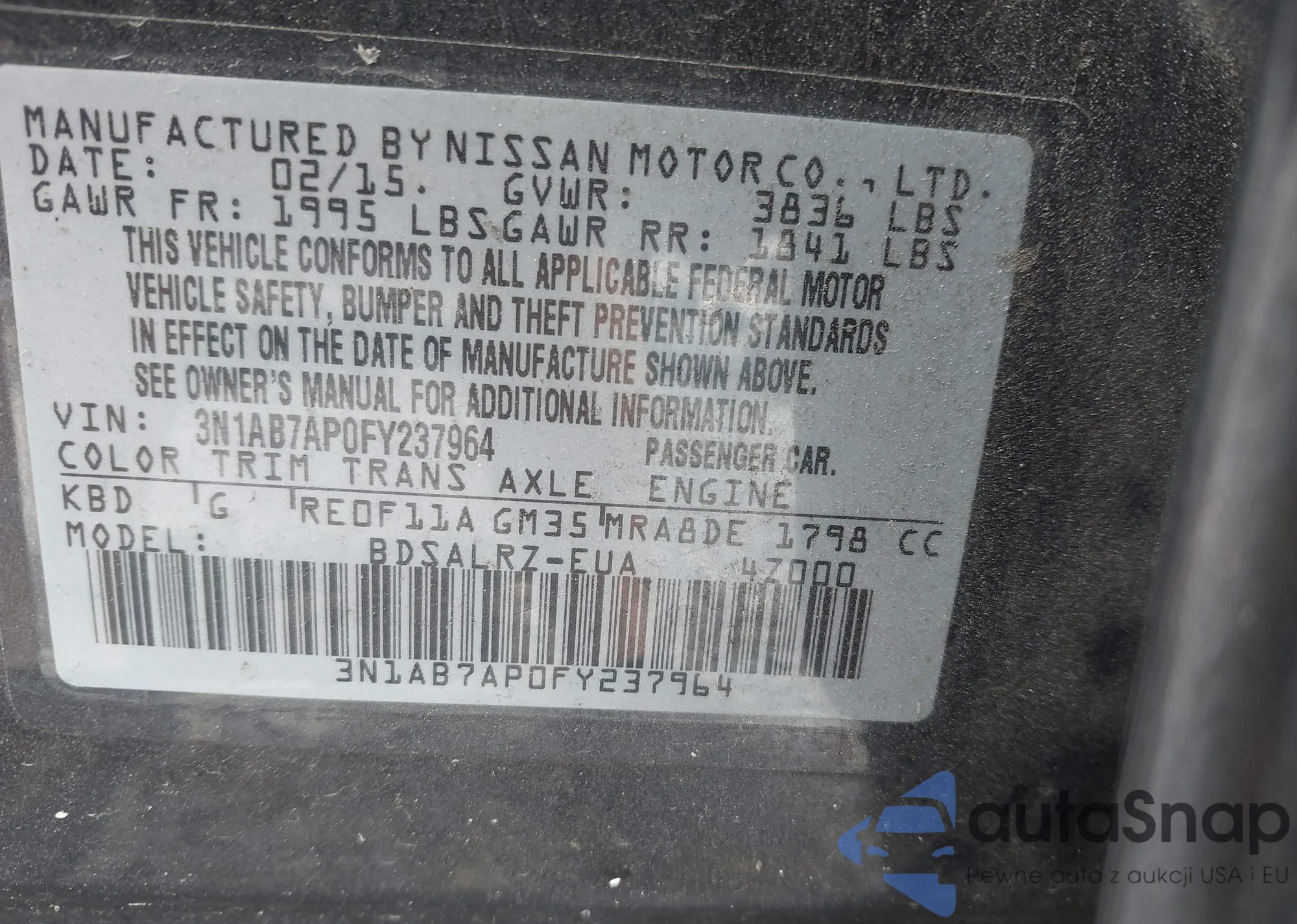 LOT: 42131069 VIN: 3N1AB7AP0FY237964