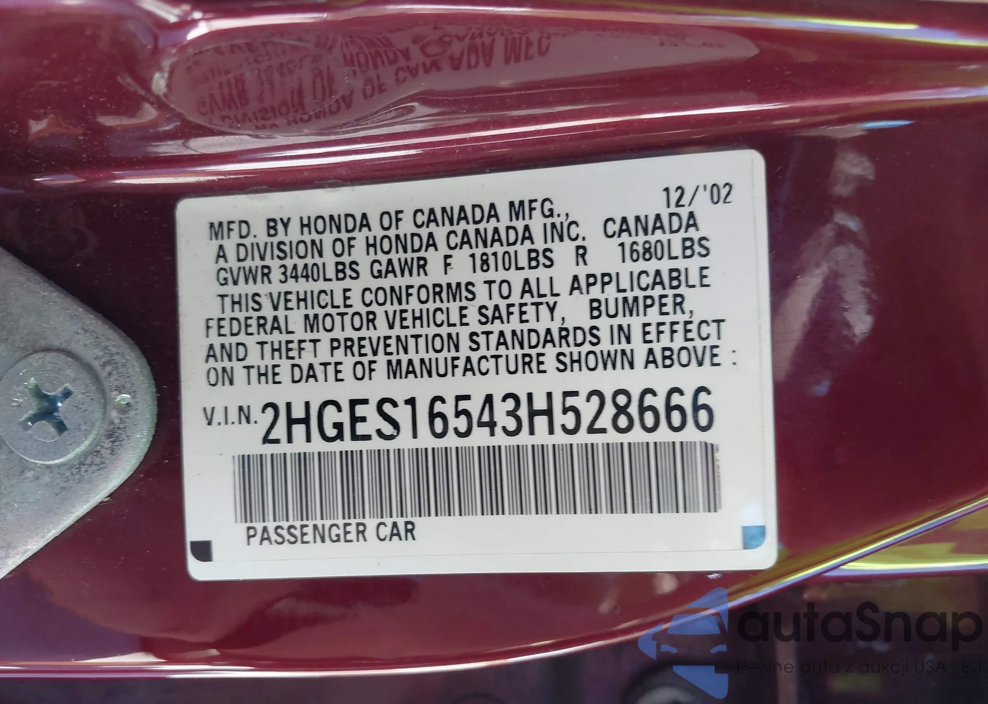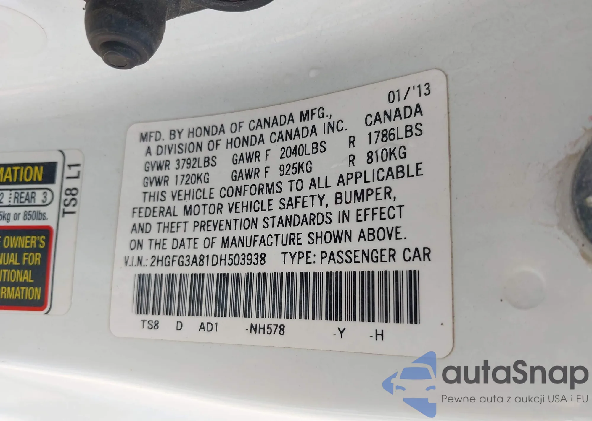• VIN 2HGFG3A81DH503938