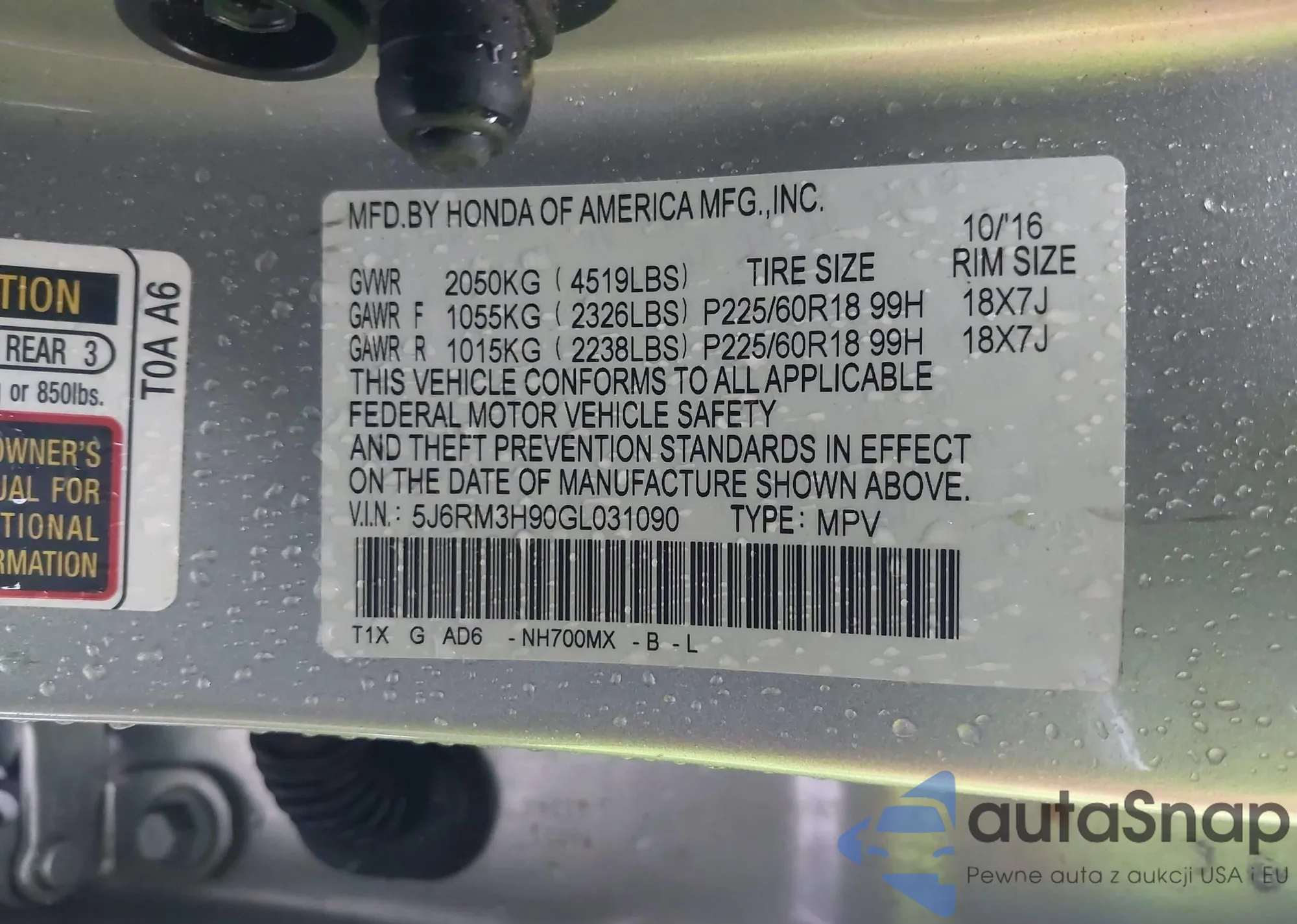• VIN 5J6RM3H90GL031090