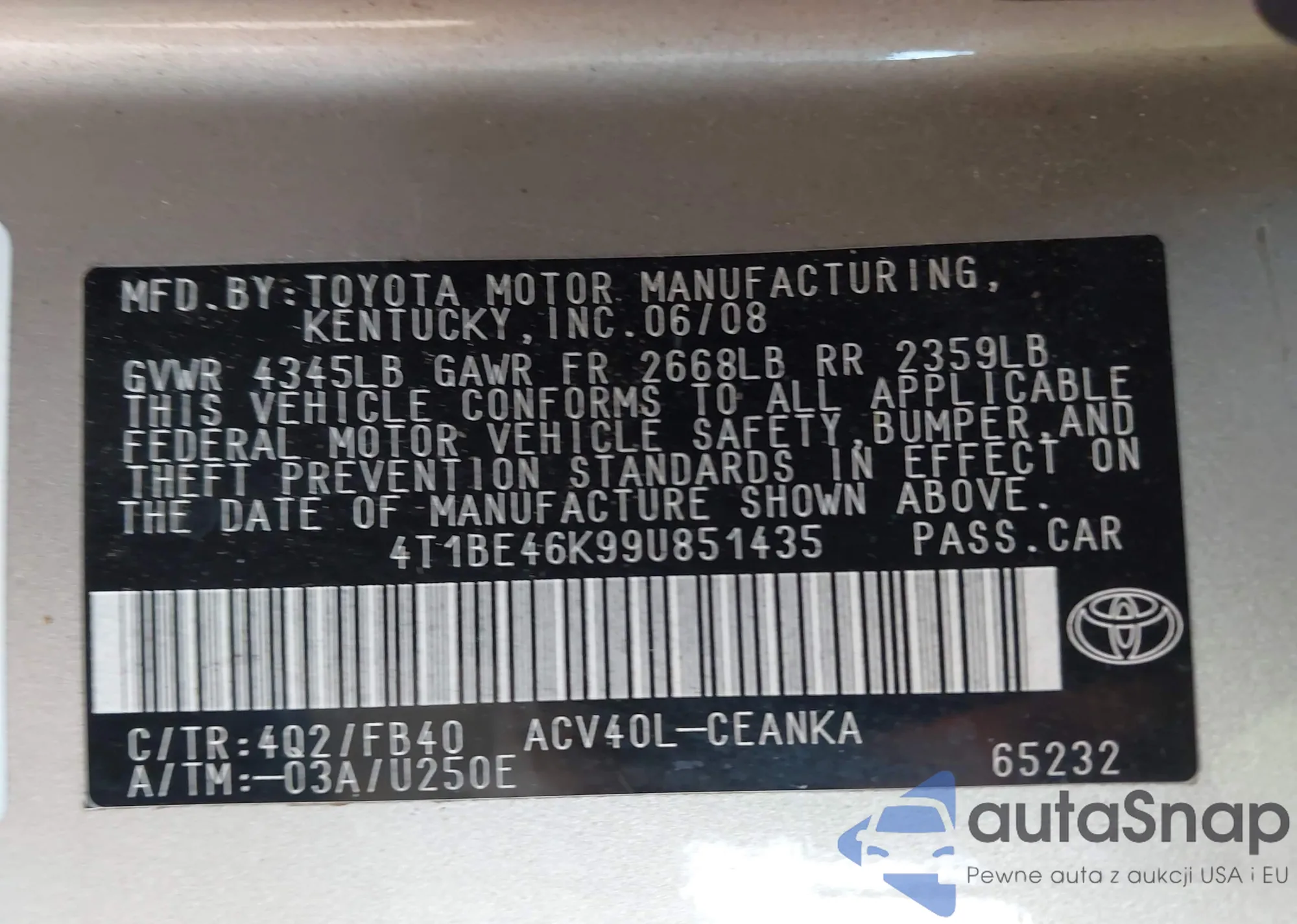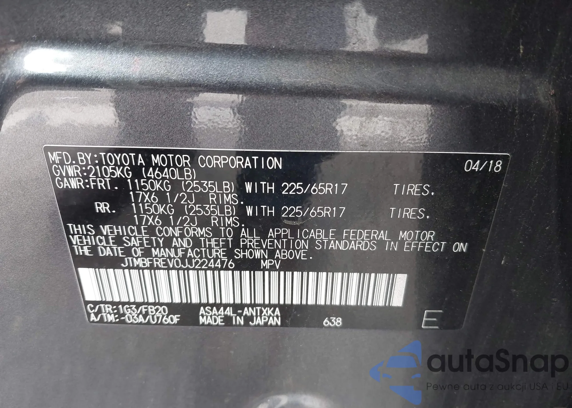LOT: 43338145 VIN: JTMBFREV0JJ224476