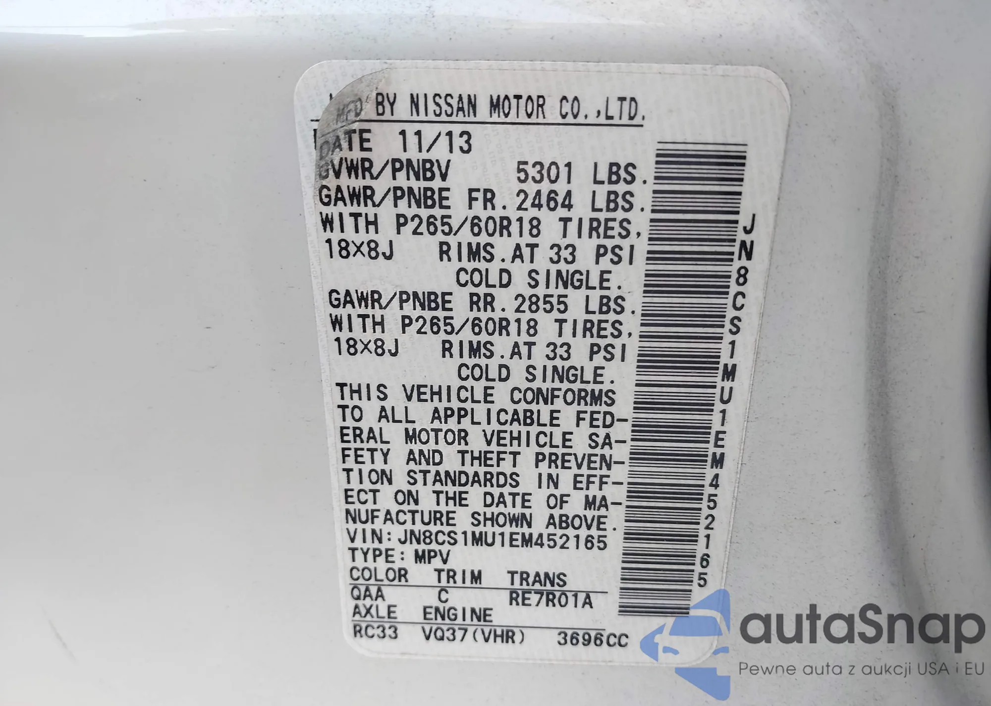 LOT: 43338515 VIN: JN8CS1MU1EM452165