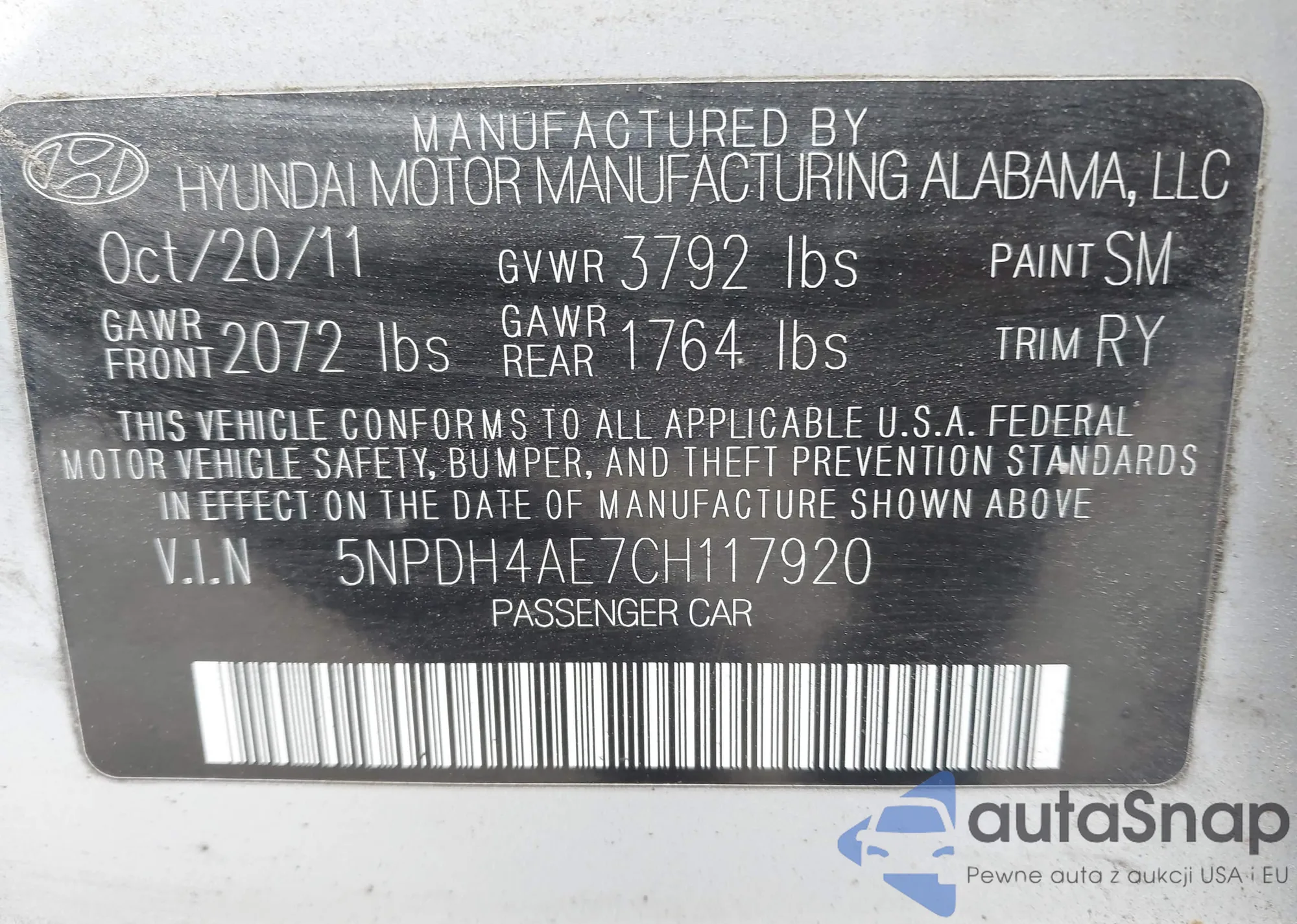 LOT: 43543307 VIN: 5NPDH4AE7CH117920