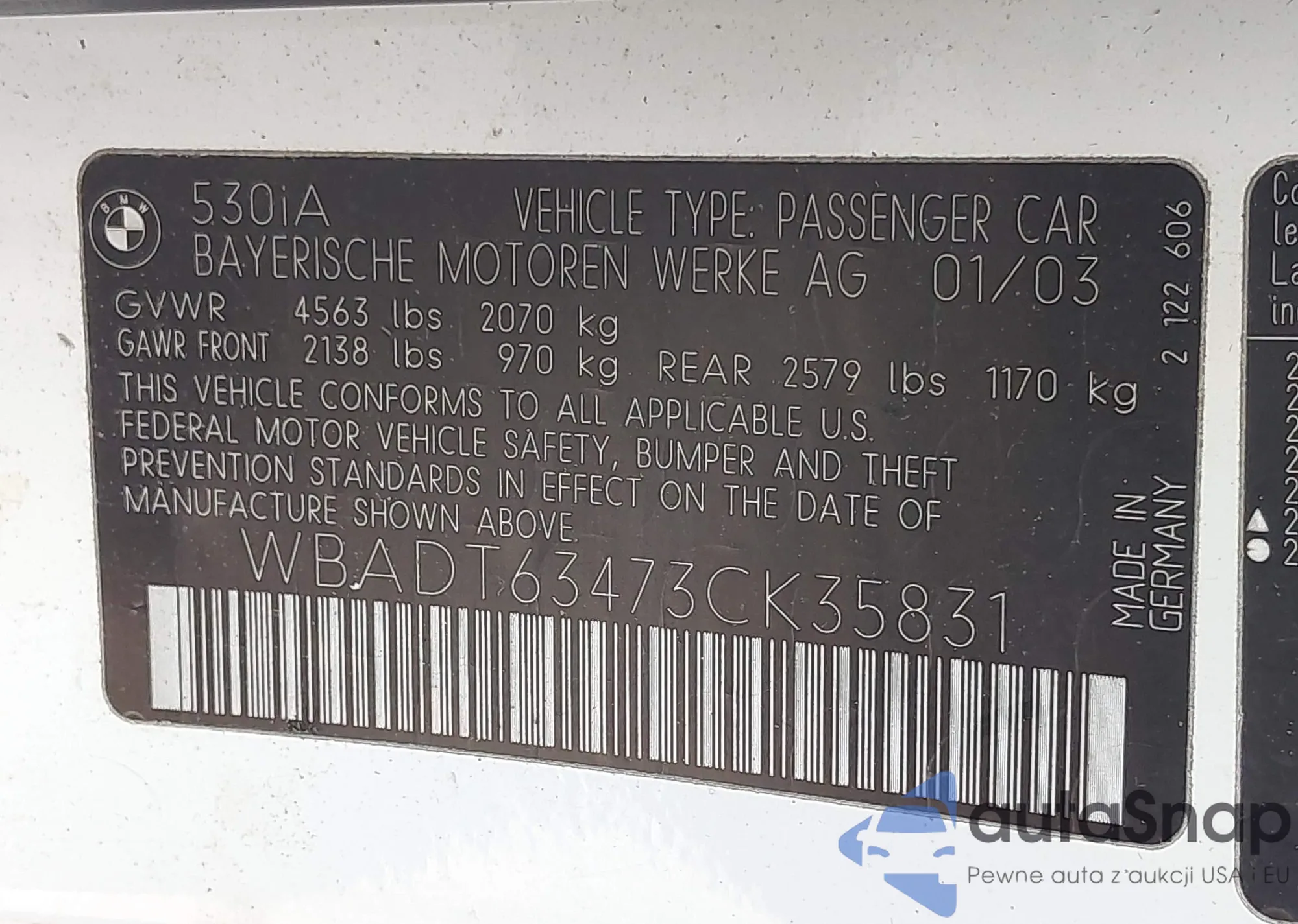2003 BMW 530Ia из США, поврежденный, VIN WBADT63473CK35831