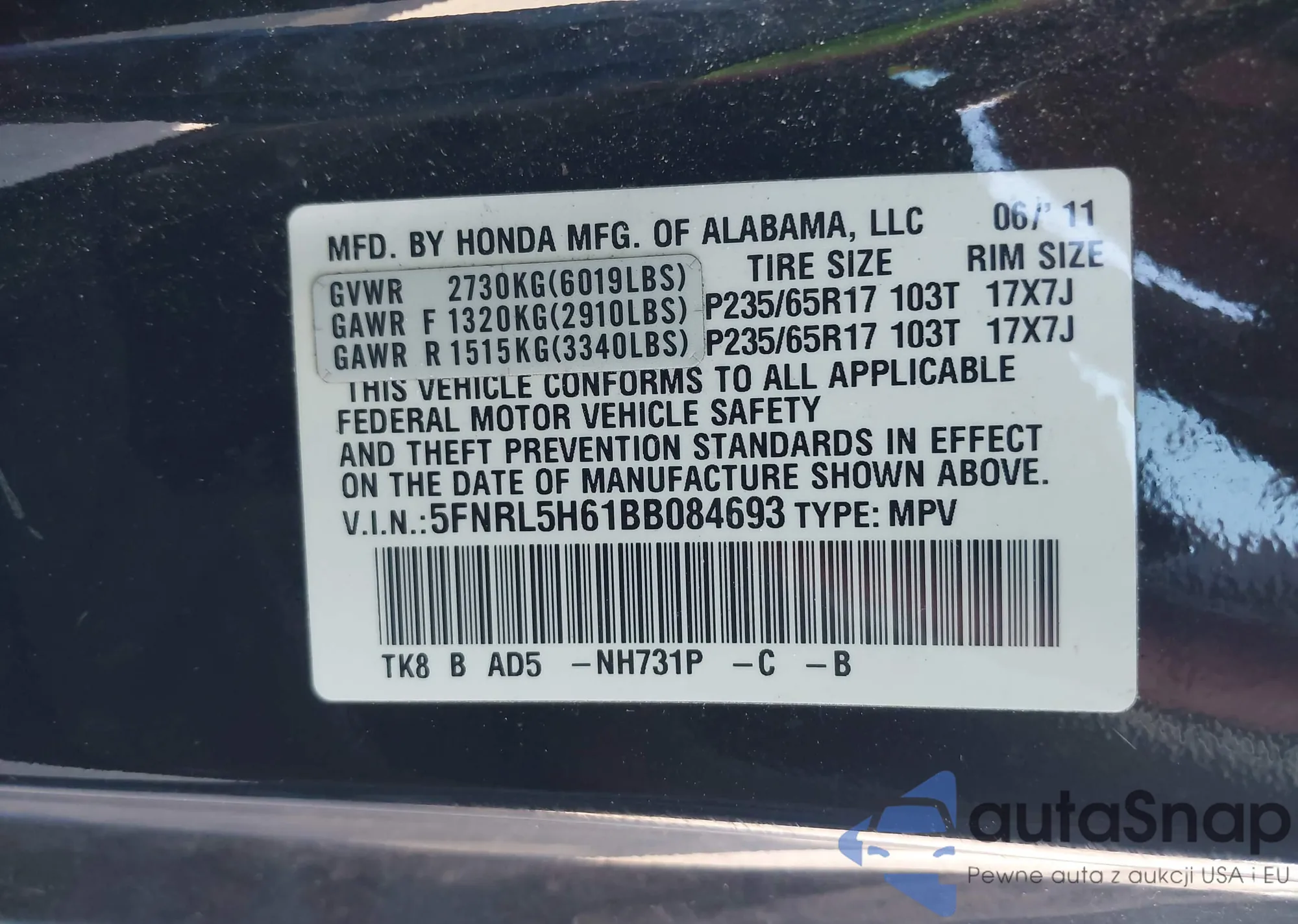 • VIN 5FNRL5H61BB084693