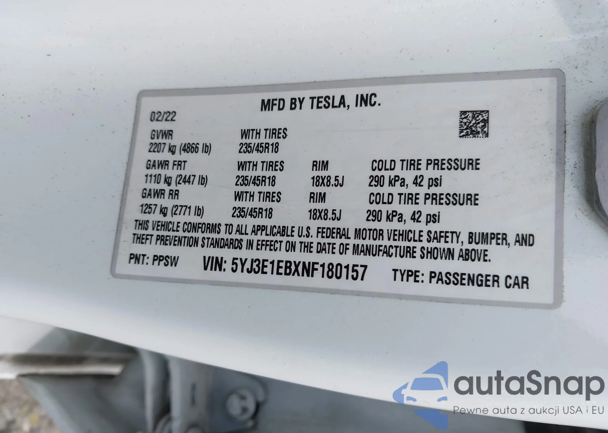 LOT: 43331221 VIN: 5YJ3E1EBXNF180157