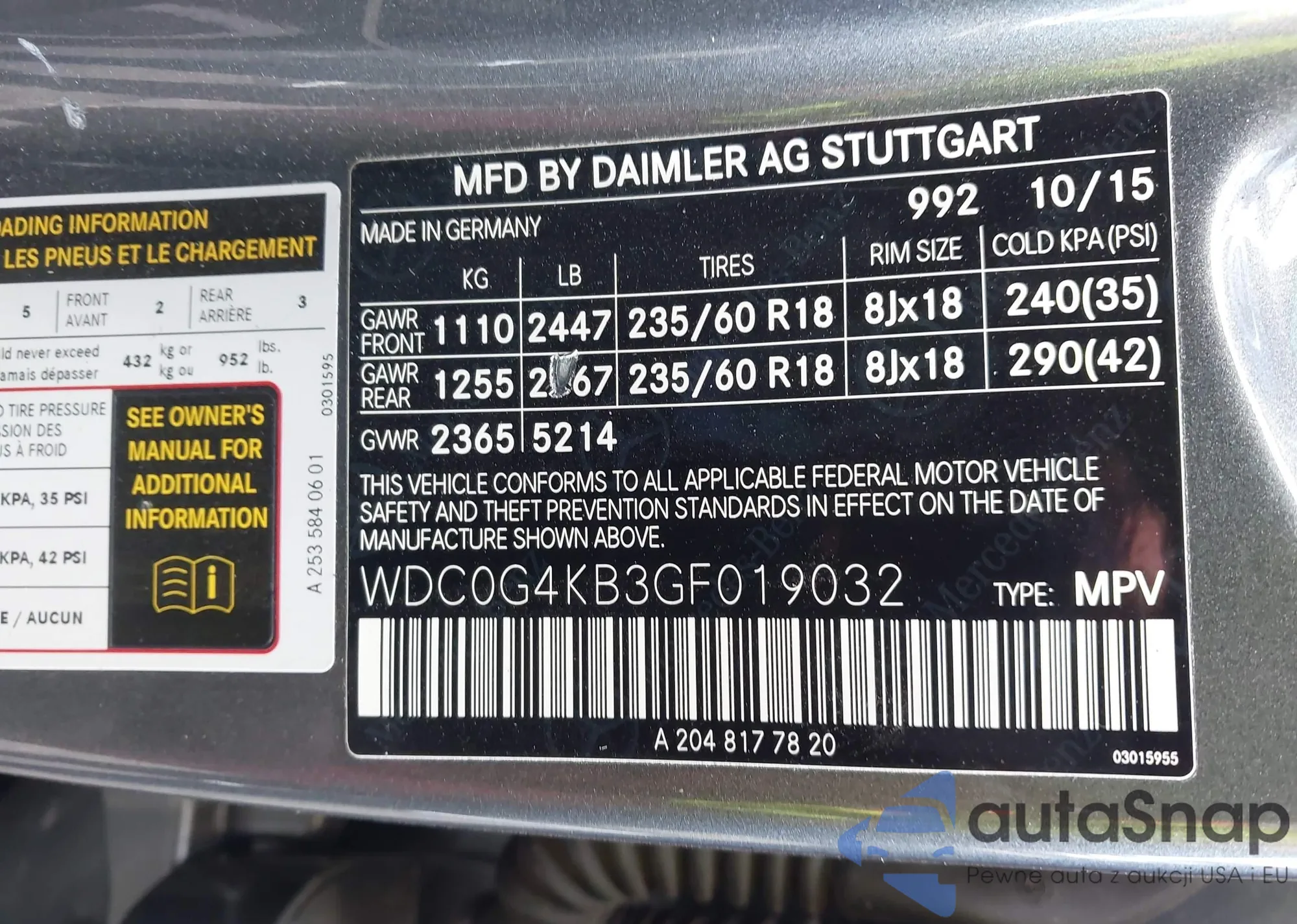 LOT: 43448002 VIN: WDC0G4KB3GF019032