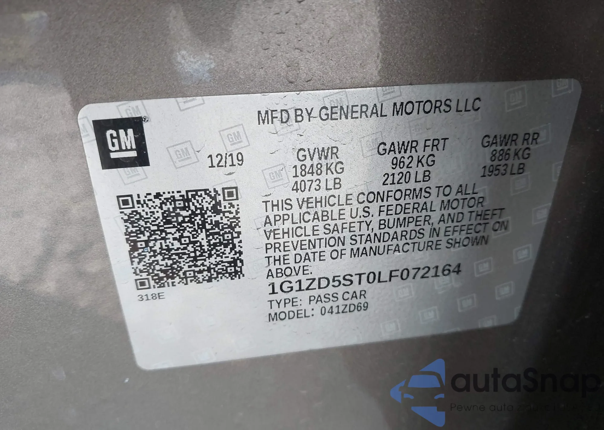 LOT: 43311229 VIN: 1G1ZD5ST0LF072164