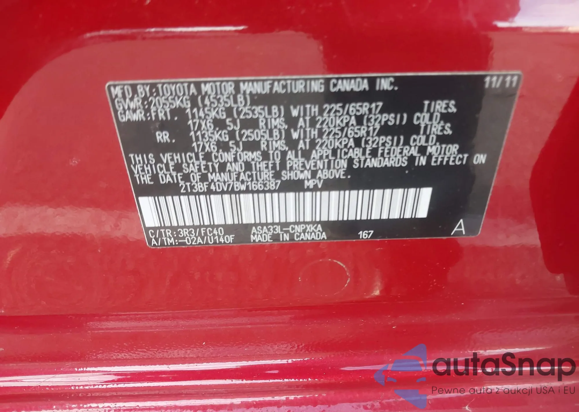 • VIN 2T3BF4DV7BW166387