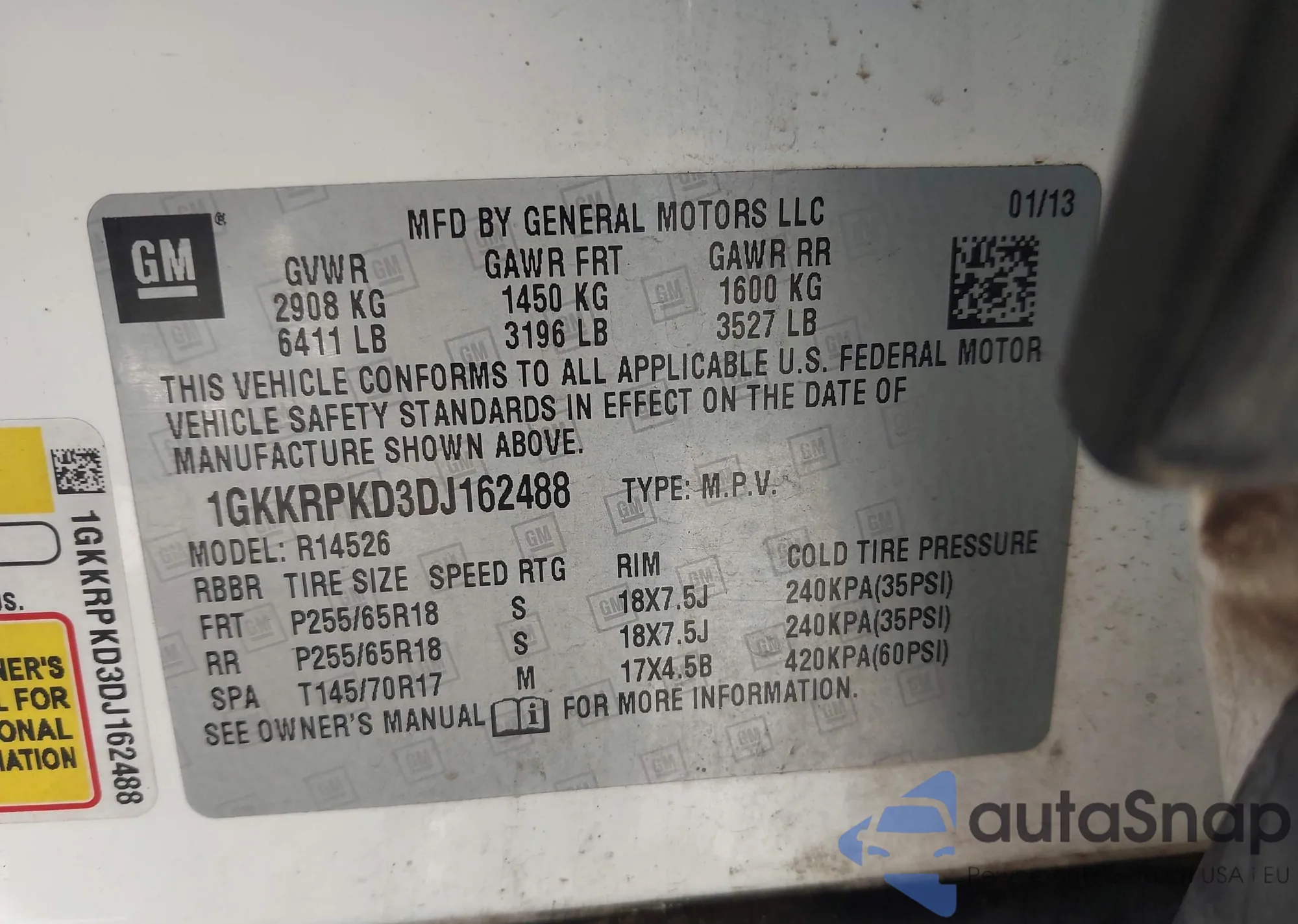 LOT: 42838189 VIN: 1GKKRPKD3DJ162488