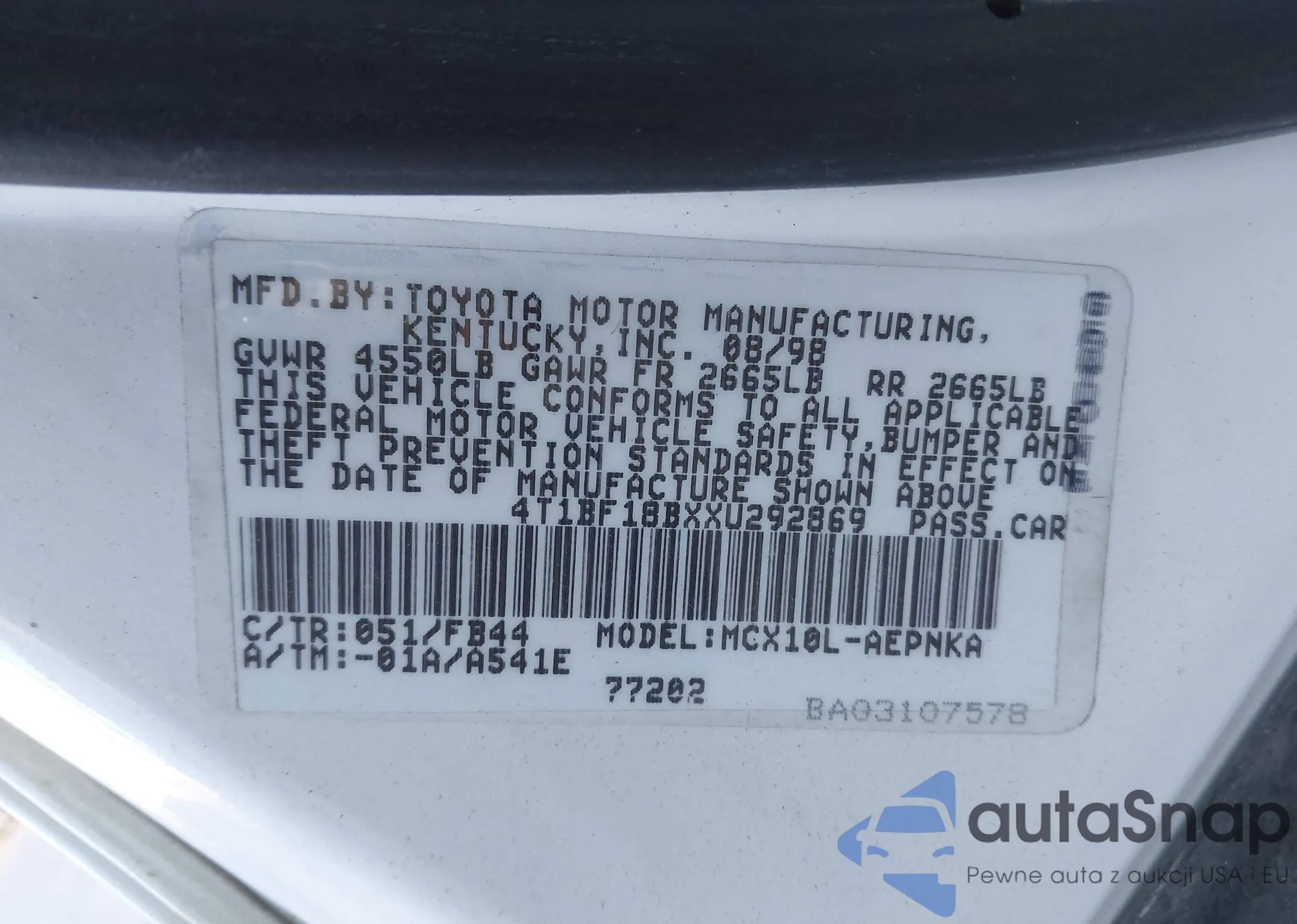 • VIN 4T1BF18BXXU292869