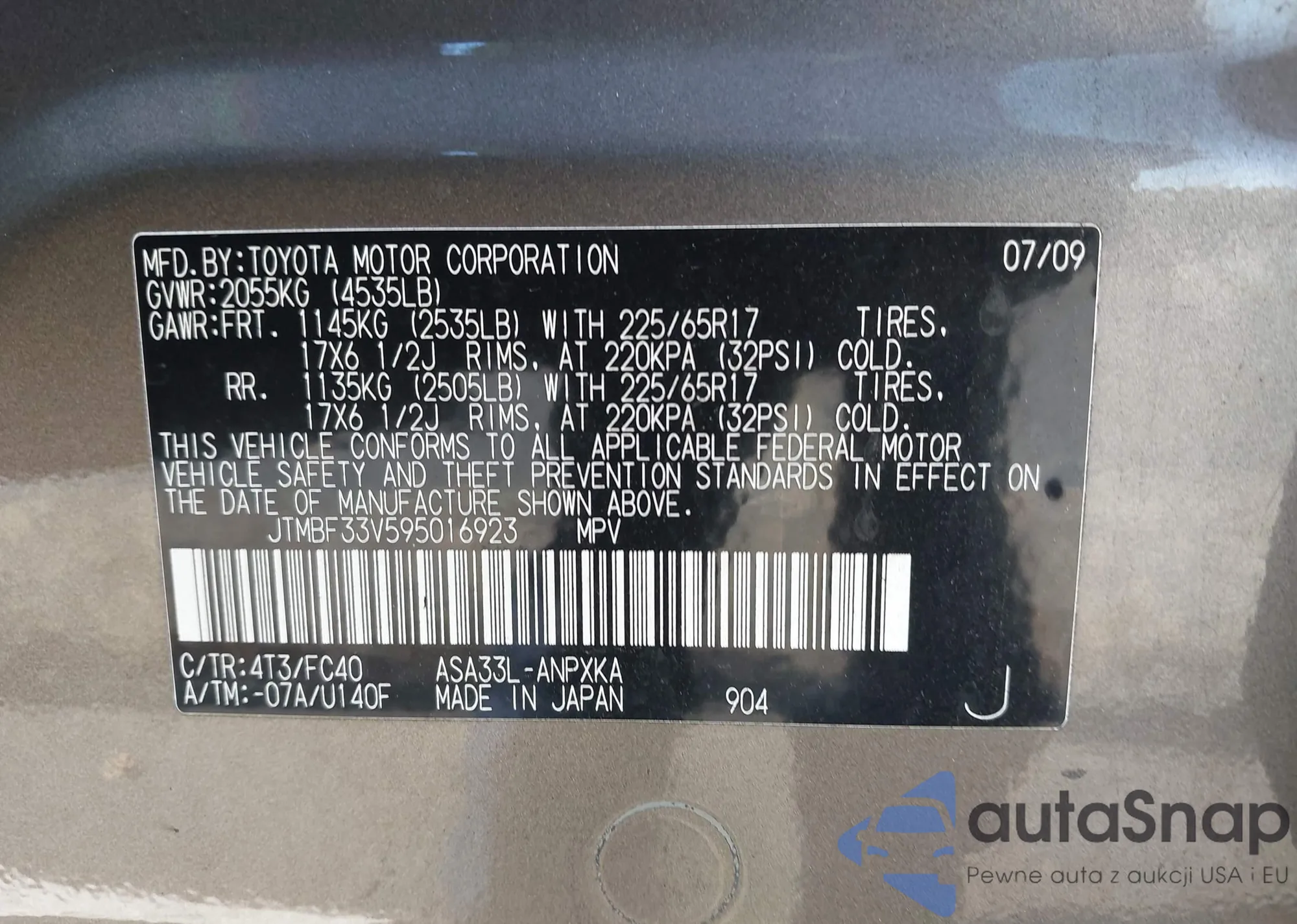 LOT: 43351665 VIN: JTMBF33V595016923