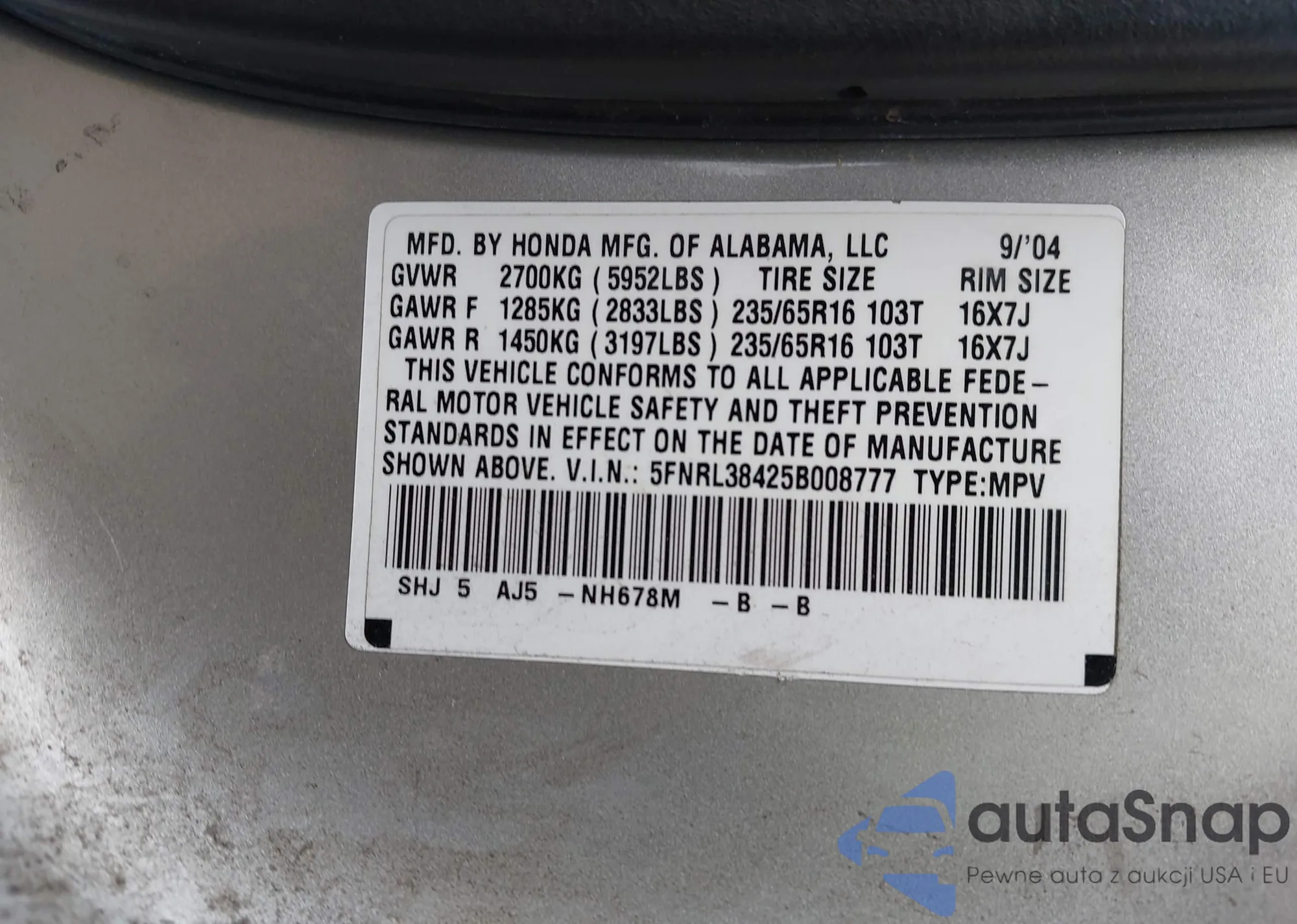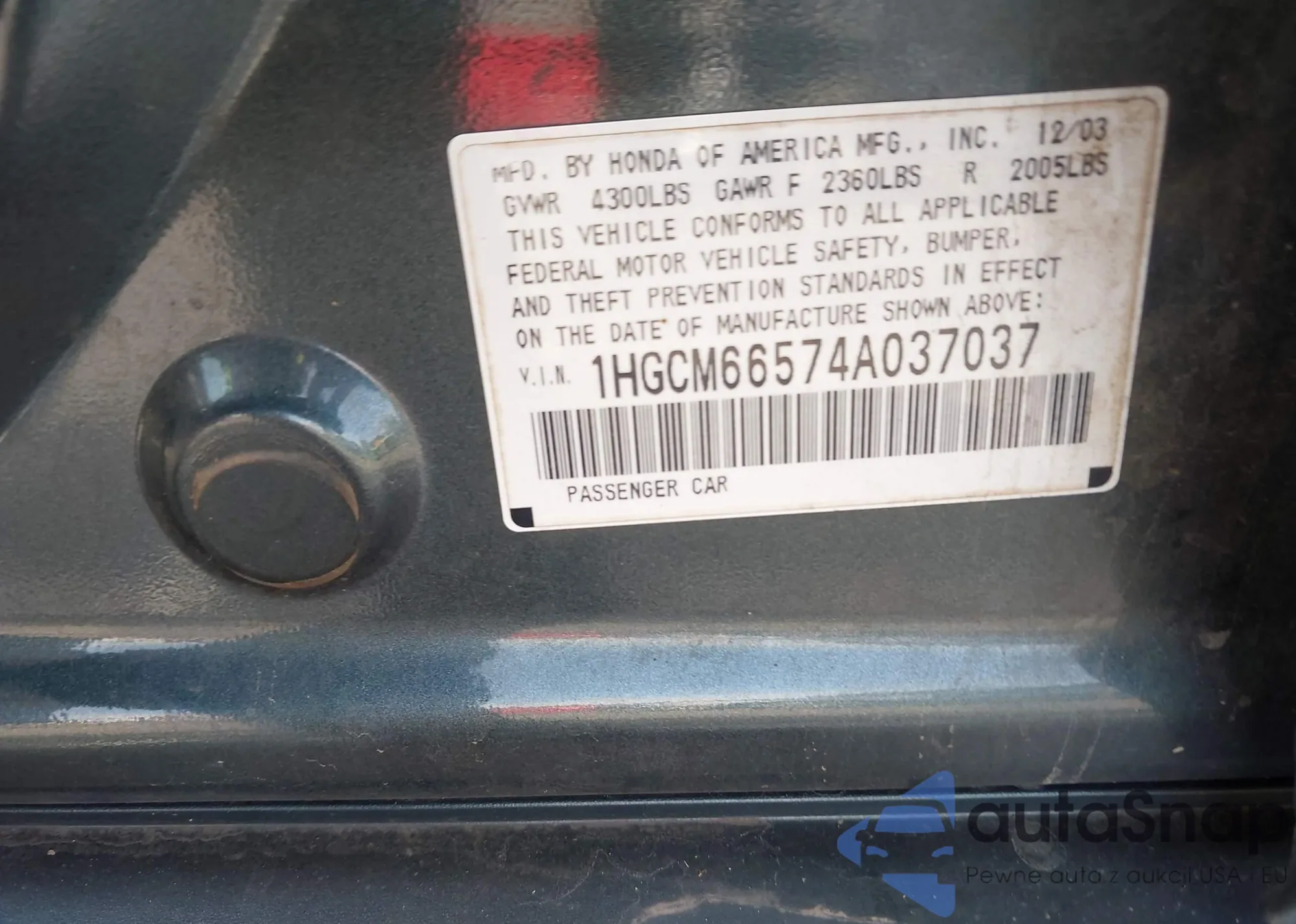 LOT: 43344890 VIN: 1HGCM66574A037037