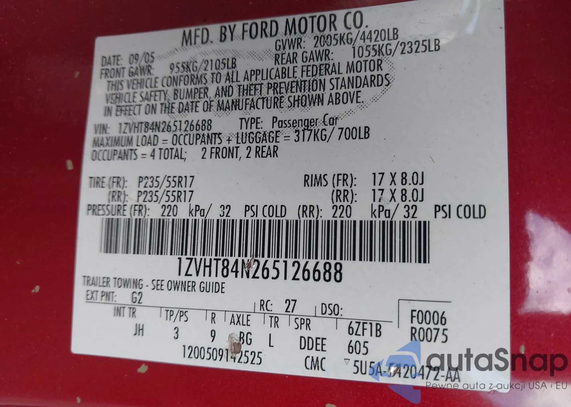 LOT: 43430649 VIN: 1ZVHT84N265126688