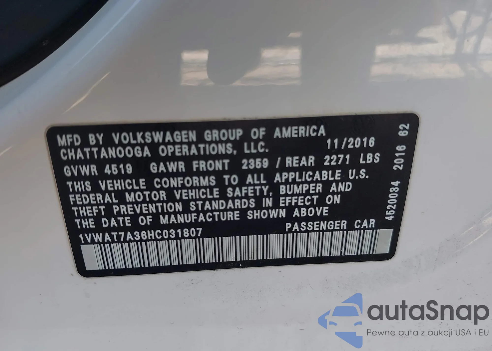 LOT: 43155383 VIN: 1VWAT7A36HC031807