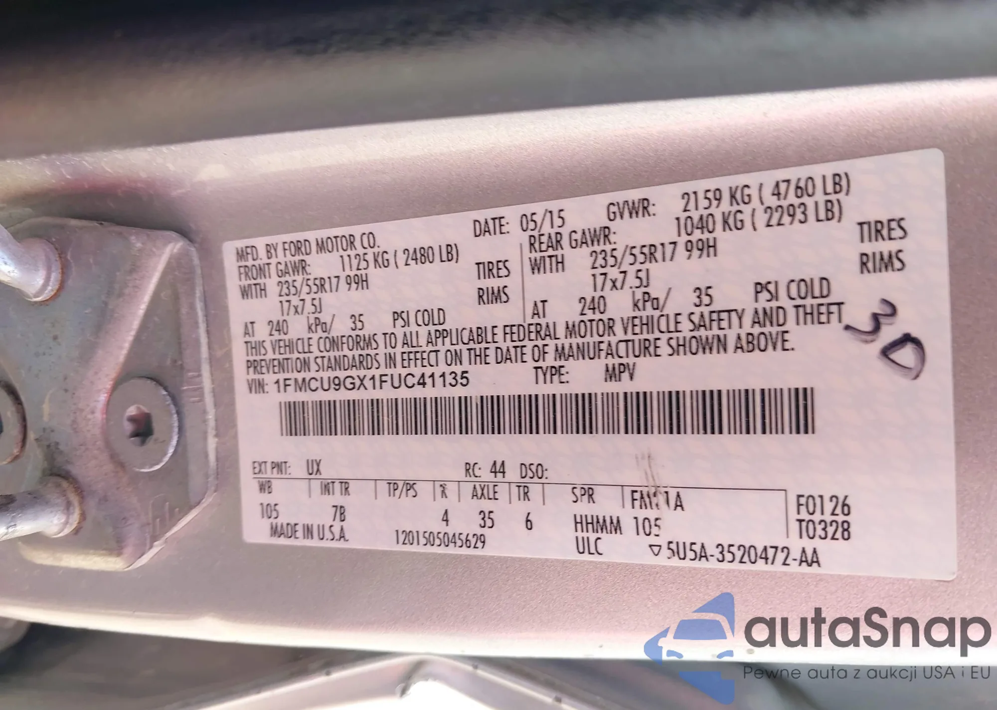 • VIN 1FMCU9GX1FUC41135