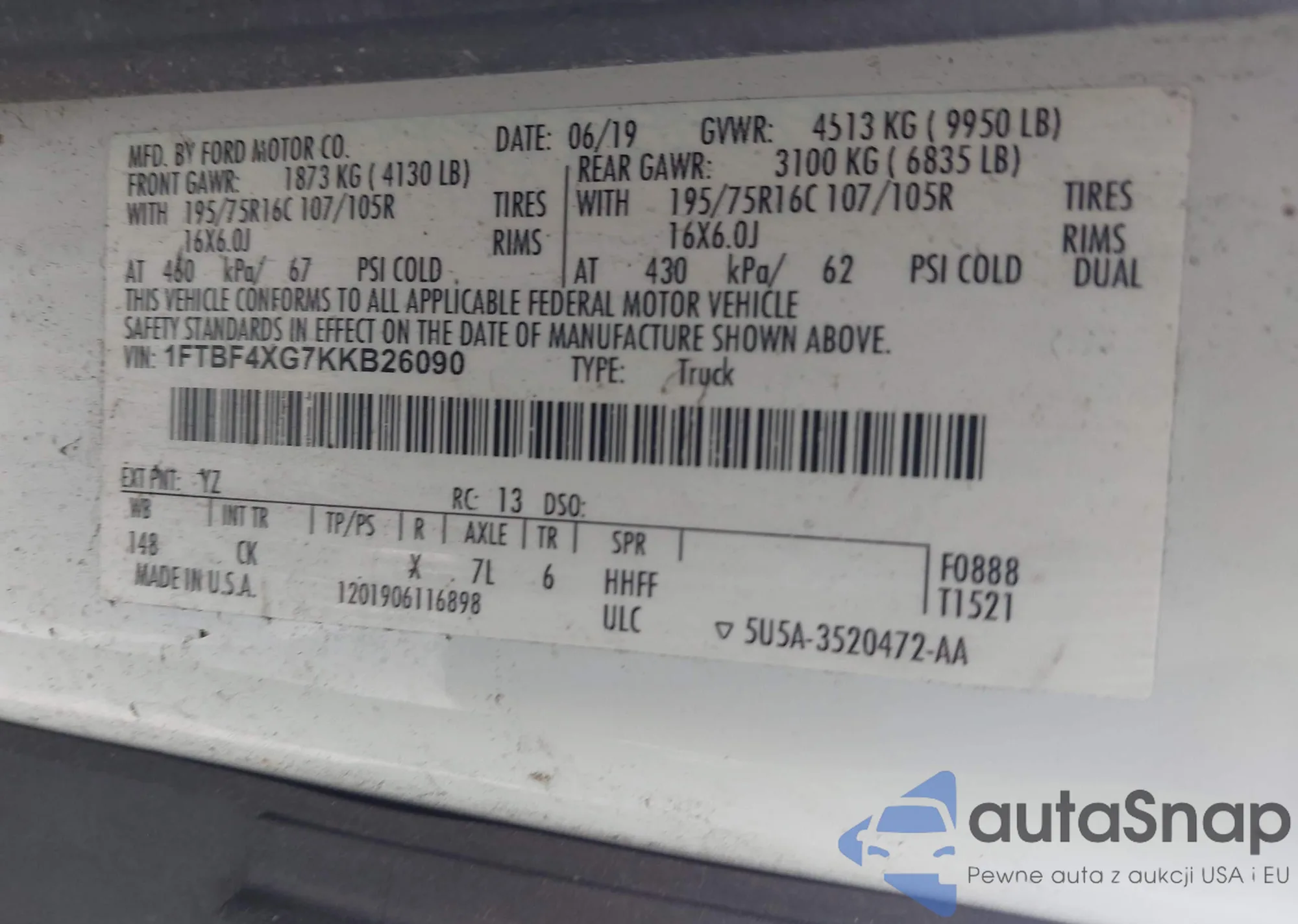 • VIN 1FTBF4XG7KKB26090