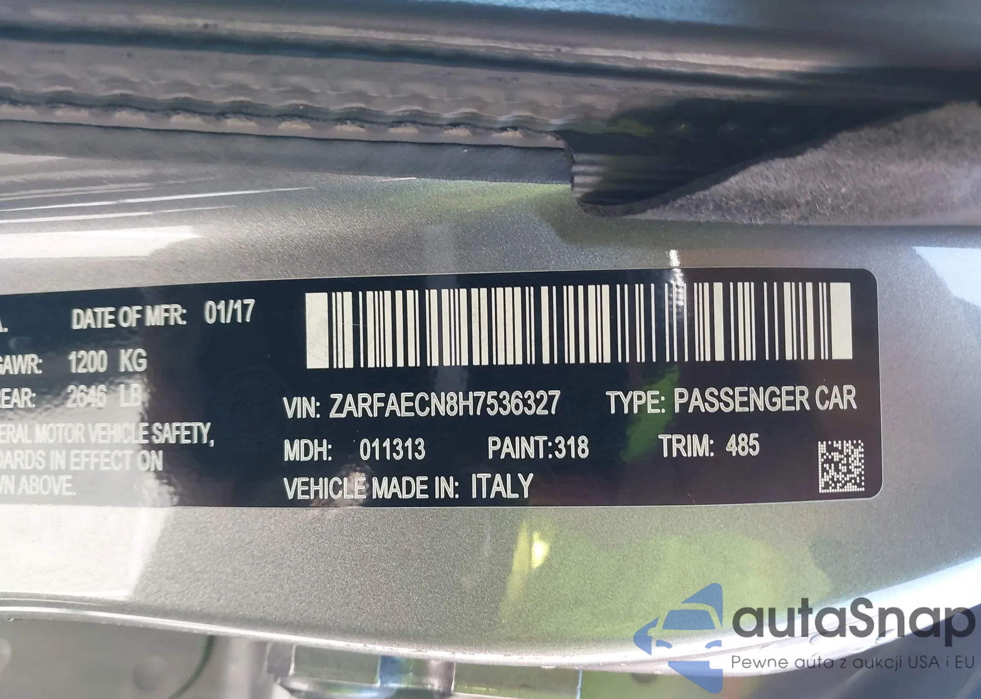 LOT: 40645297 VIN: ZARFAECN8H7536327