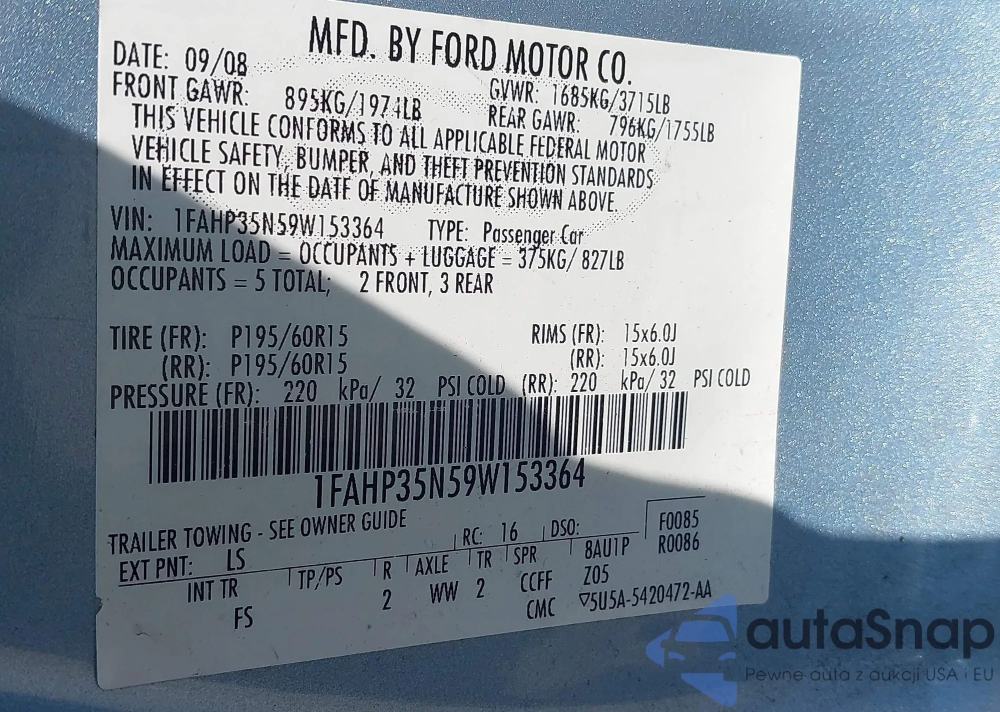 LOT: 43356701 VIN: 1FAHP35N59W153364