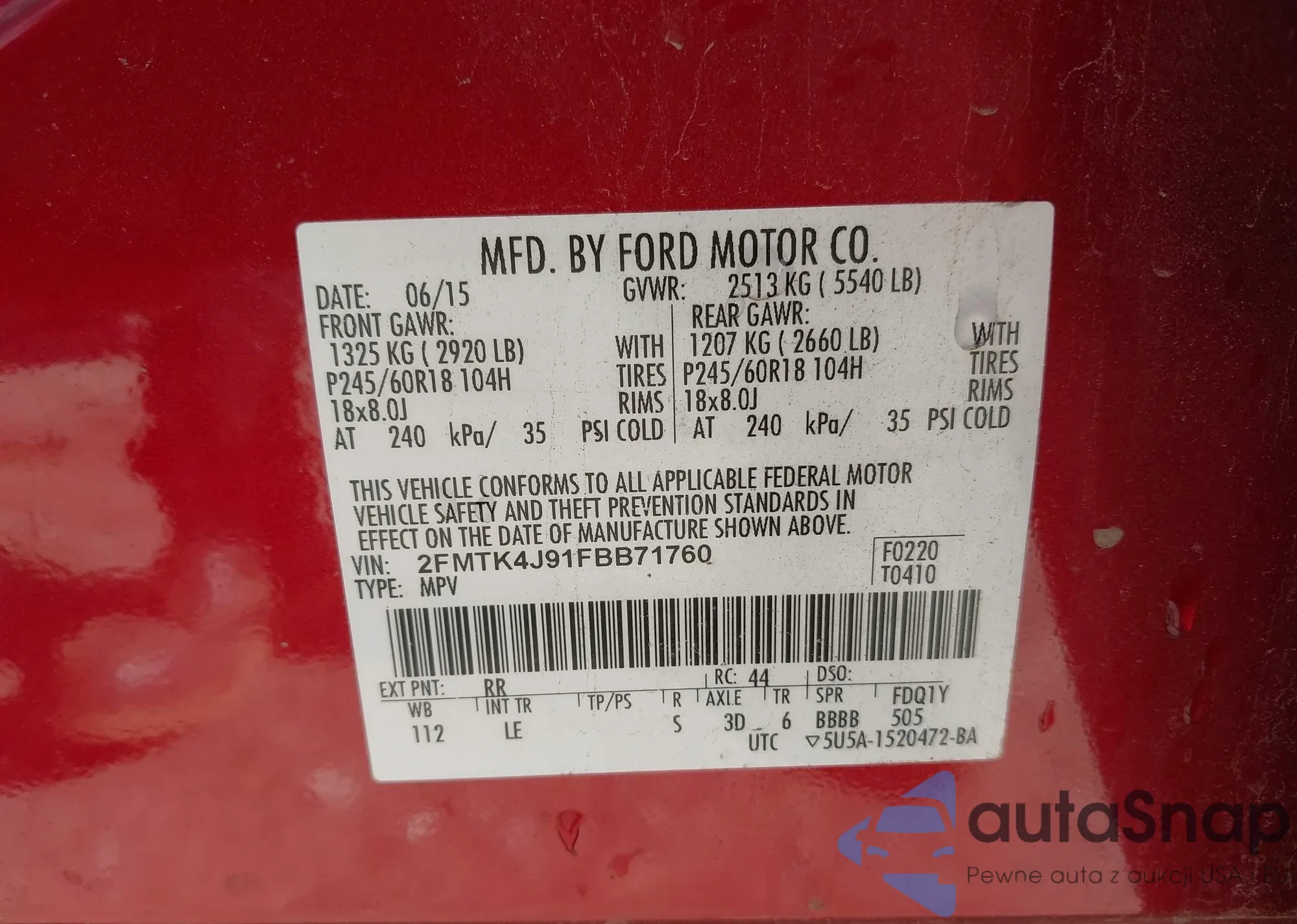 LOT: 43134540 VIN: 2FMTK4J91FBB71760