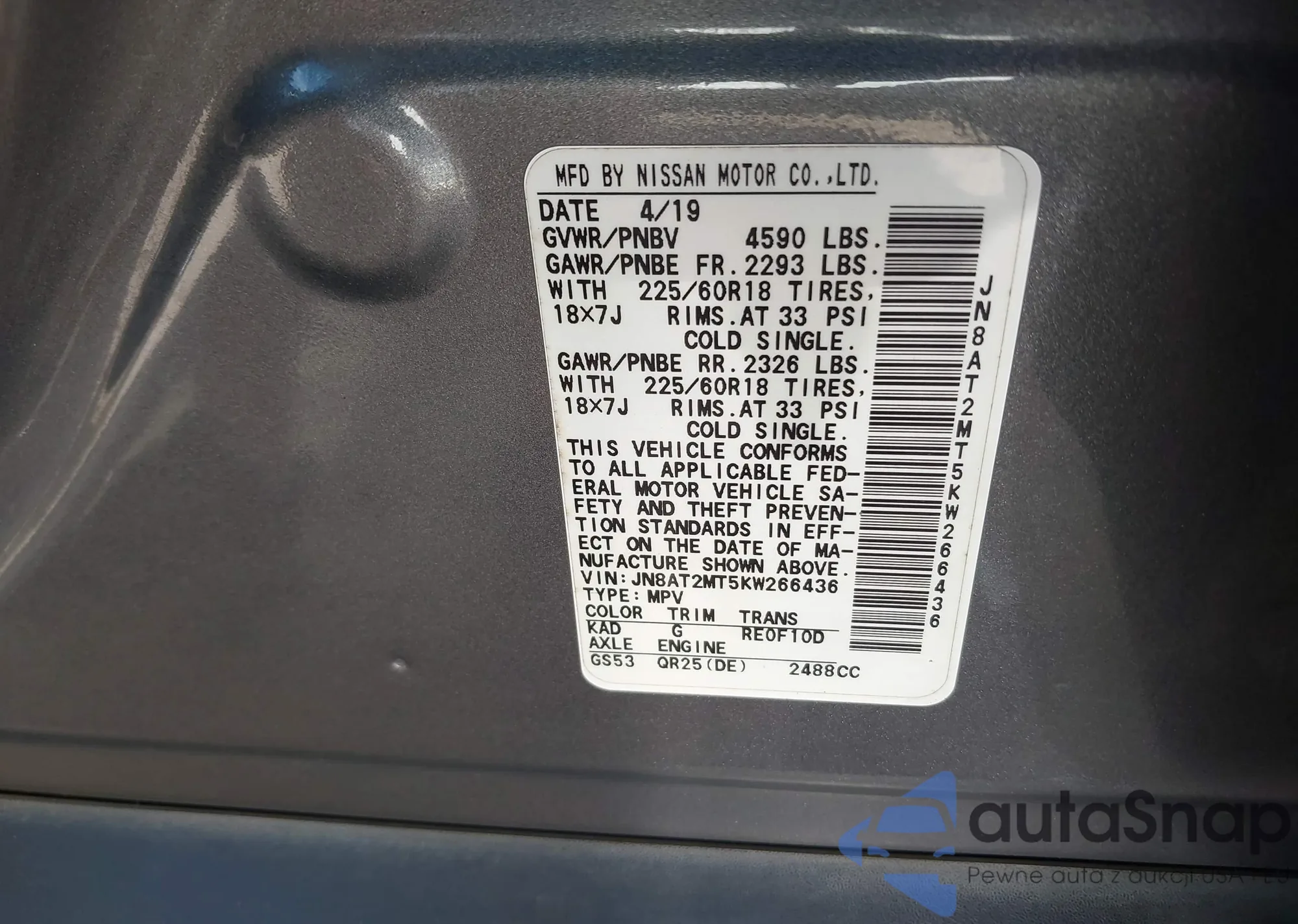 LOT: 43464504 VIN: JN8AT2MT5KW266436