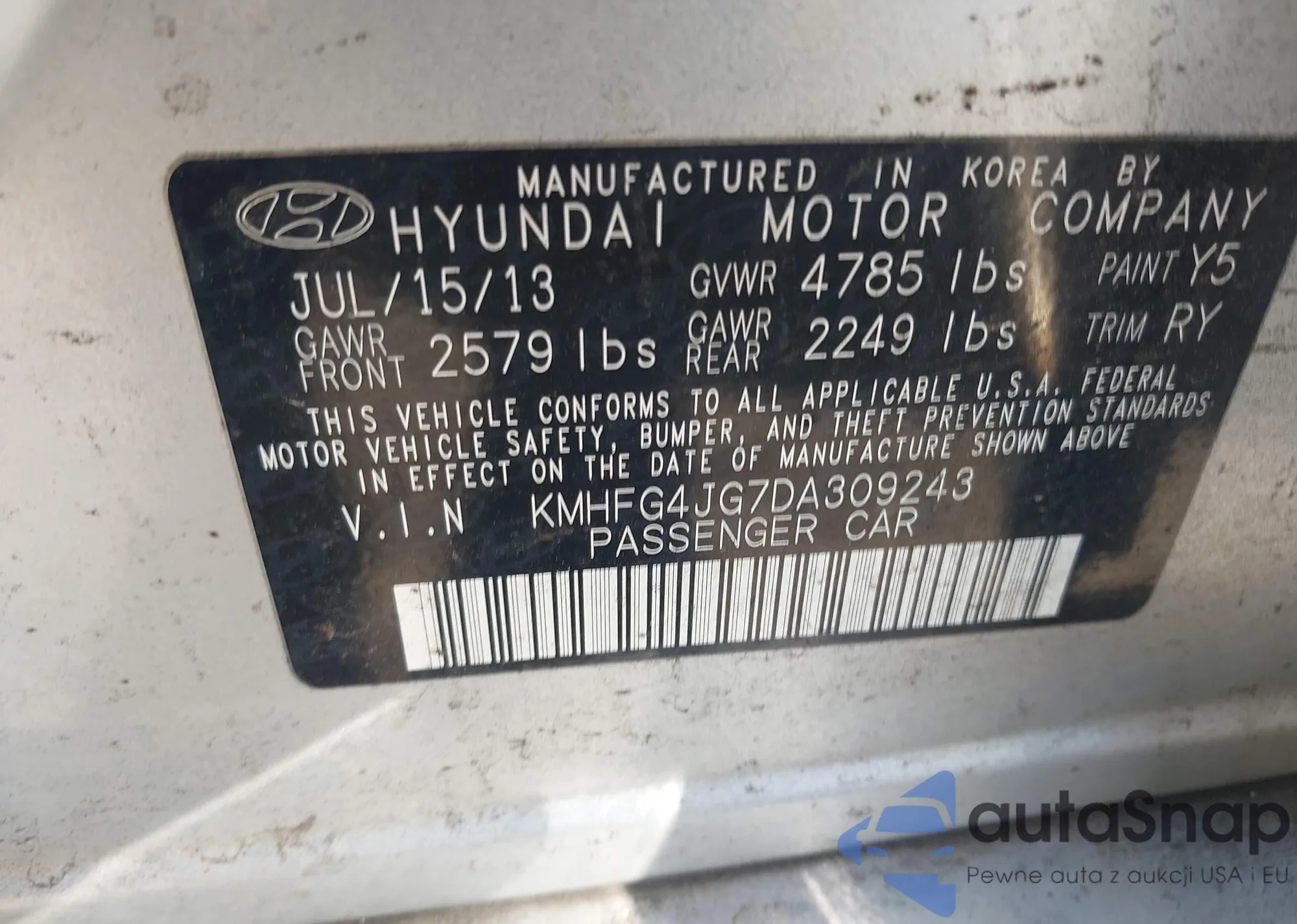 LOT: 43546618 VIN: 5NMSG13D99H251041