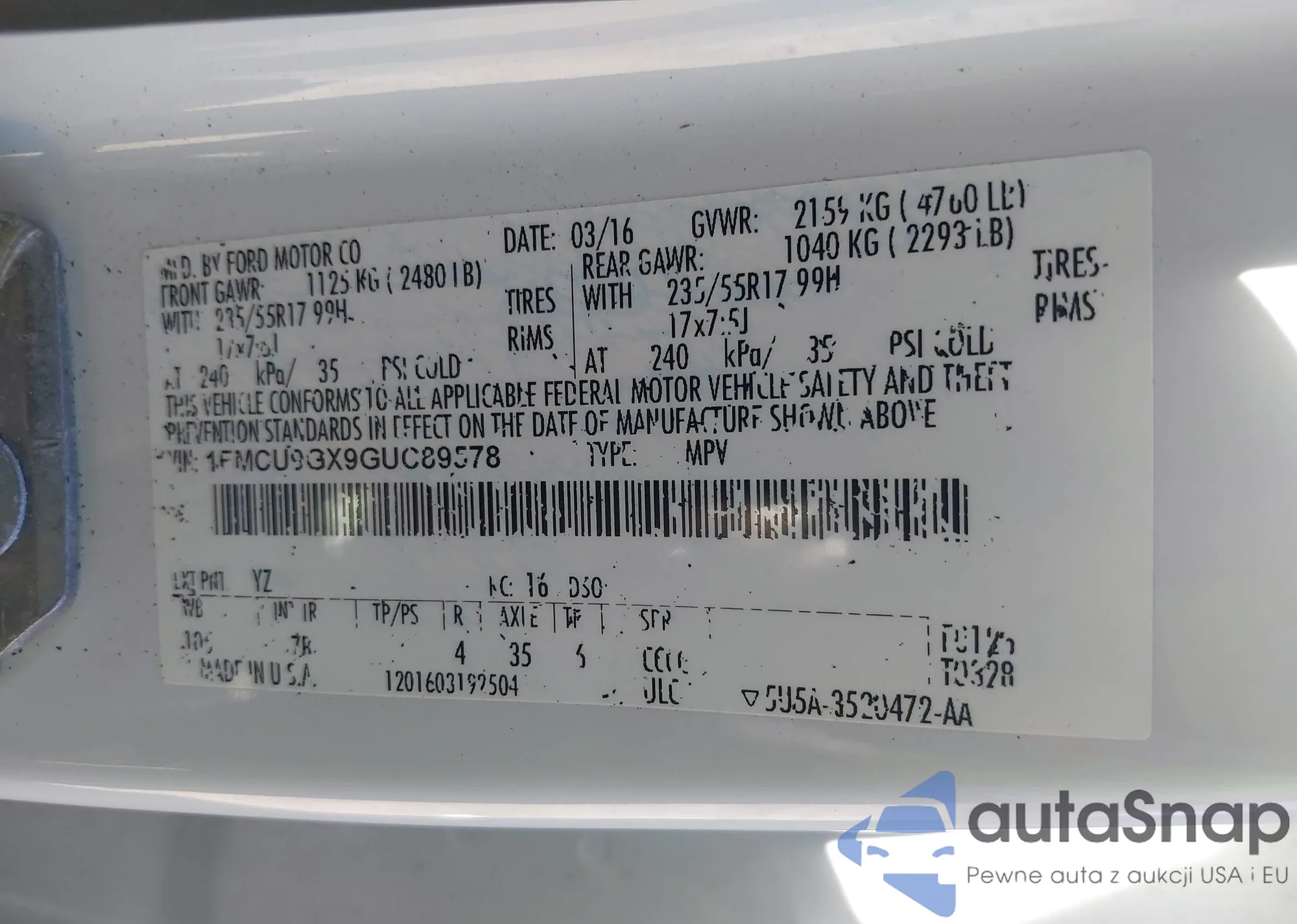 • VIN 1FMCU9GX9GUC89578