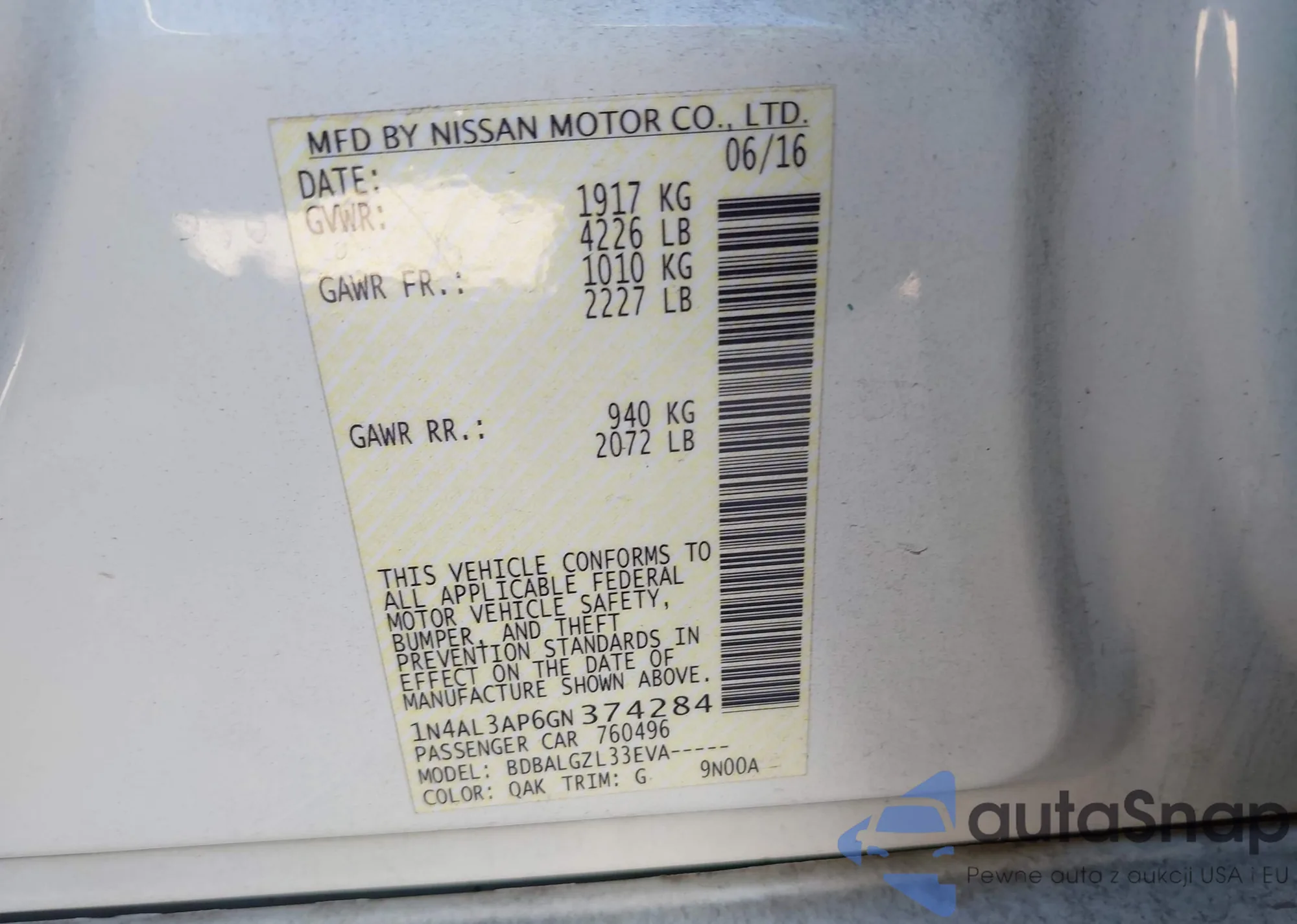 LOT: 43570617 VIN: 1N4AL3AP6GN374284