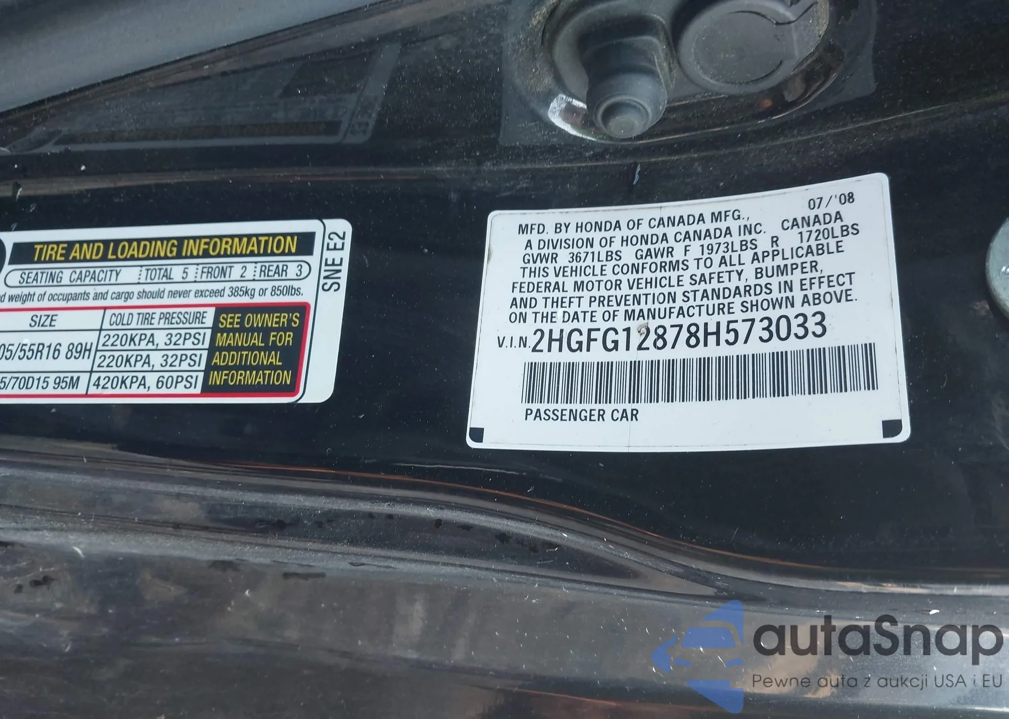 LOT: 42884067 VIN: 2HGFG12878H573033