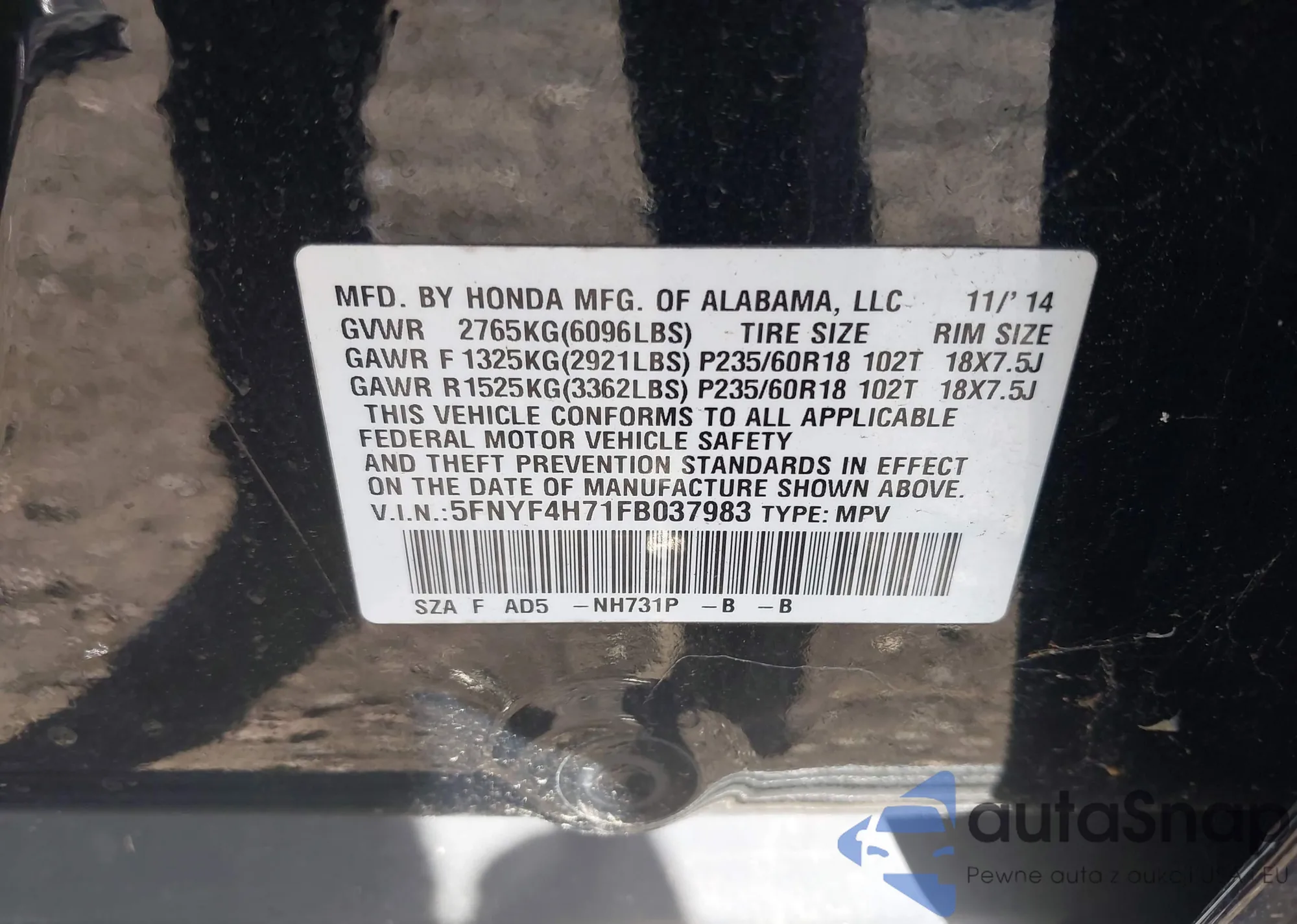 • VIN 5FNYF4H71FB037983