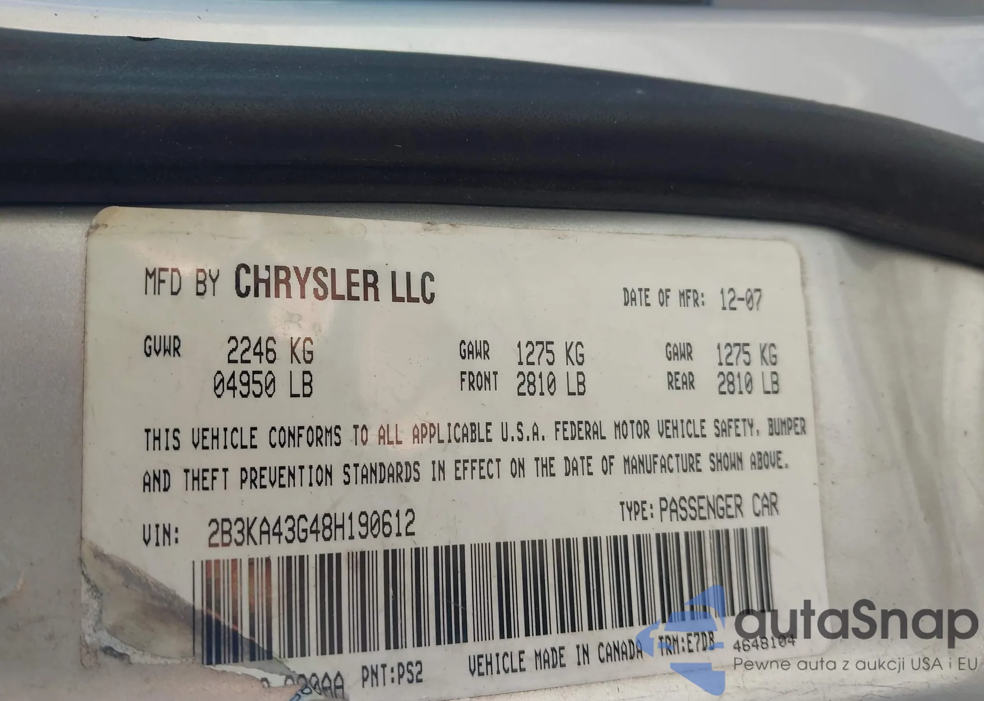 • VIN 2B3KA43G48H190612